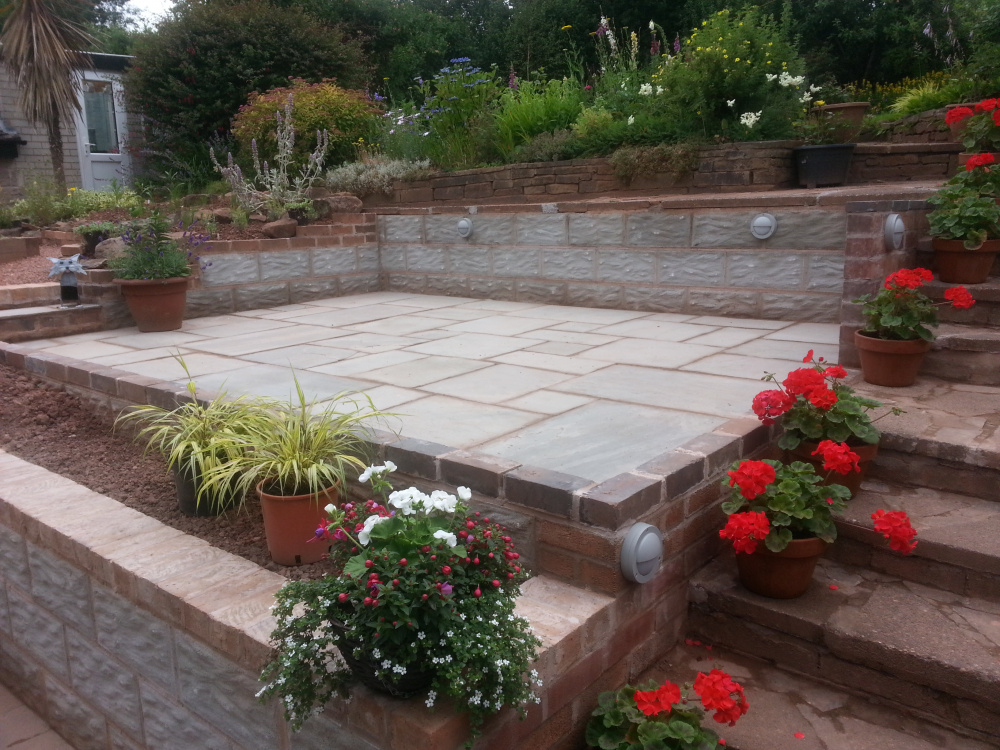 We converted our sloped garden into two terraces and love it. We have a trampoline and a shed on the second terrace. Definitely couldn't have put the trampoline on a slope! Mine has a brick wall retaining the bottom terrace and the builder put drainage holes in the wall. Just fyi I never see water coming out of them so not sure how necessary they are lol