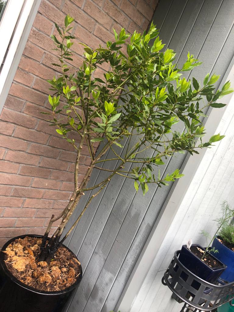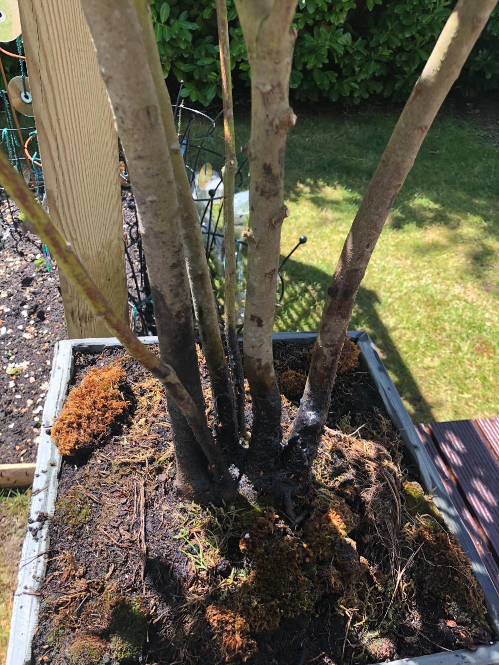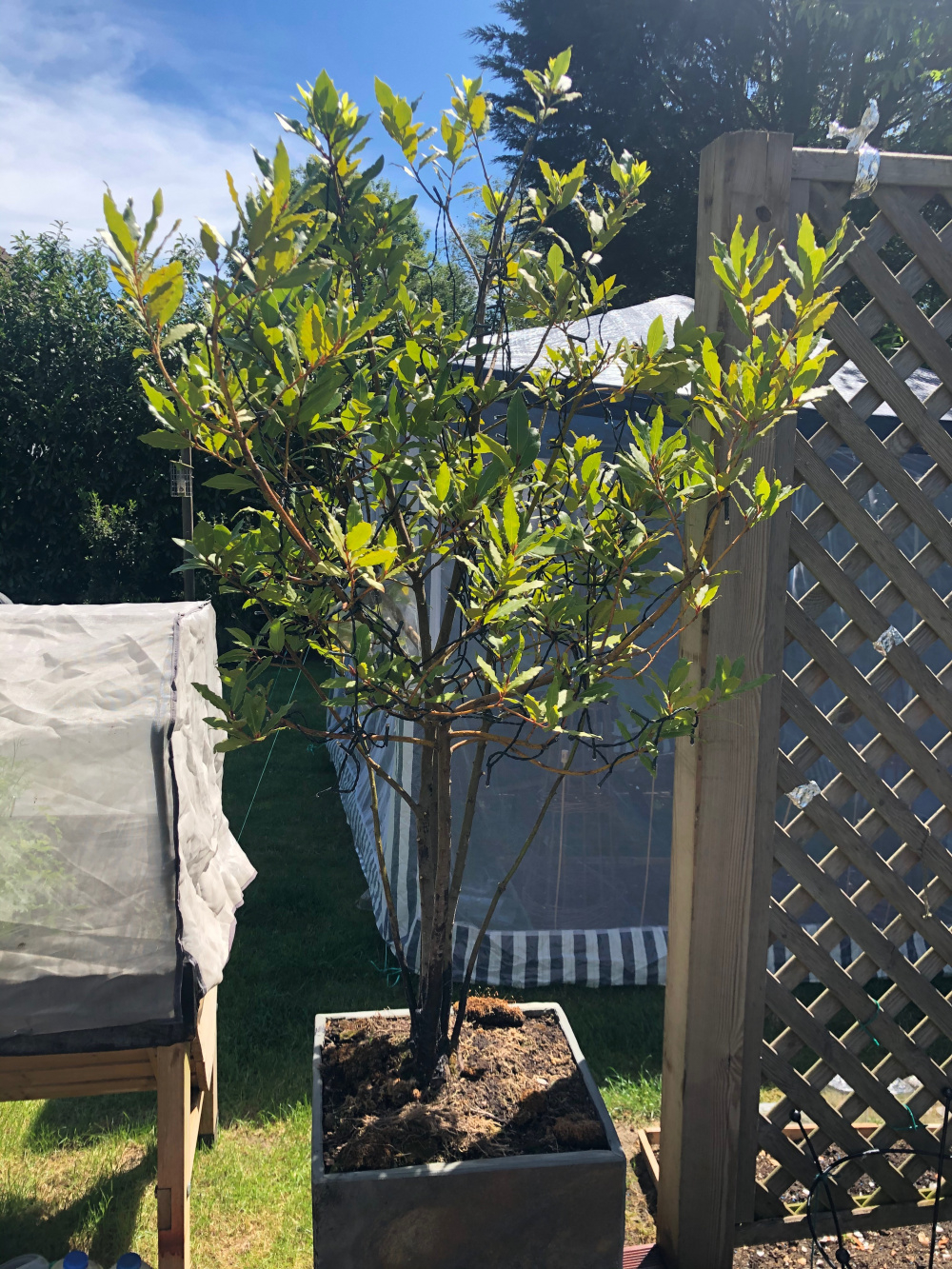 I'm a novice gardener with a Laurus nobilis - bay tree - in a large pot (I use its leaves for cooking). It has multiple trunks. I need some guidance on which trunks I should prune out to keep this tree healthy in its pot. I have taken a few photos from different angles. The black at the base of the tree is tree grease.