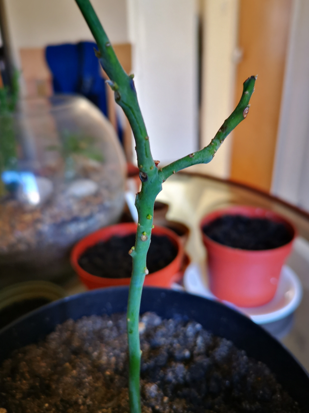 So this is where we are. Now there are no leaves at all. My question is, do you all think that there is still hope for this little plant or am I best to call it quits? I don't want to give up on it because you can see loads of new little buds on the stem, so I think it's definitely alive. If I'm to continue does anyone know whether there is anything different I should be doing?