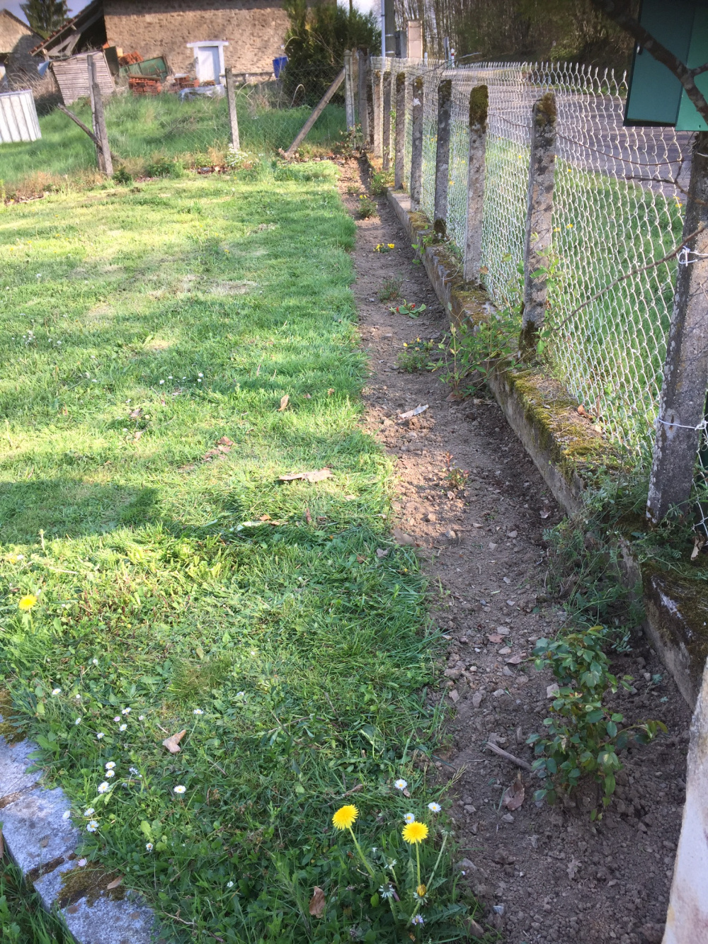 There isn’t really anything there at the moment. There are no flower beds. It’s just a mass of fern like weeds, thorn bushes and the grass isn’t even like a lawn. It’s just a mass of weeds and grasses that look like a jungle Of different plants when left and almost a lawn when cut down short.