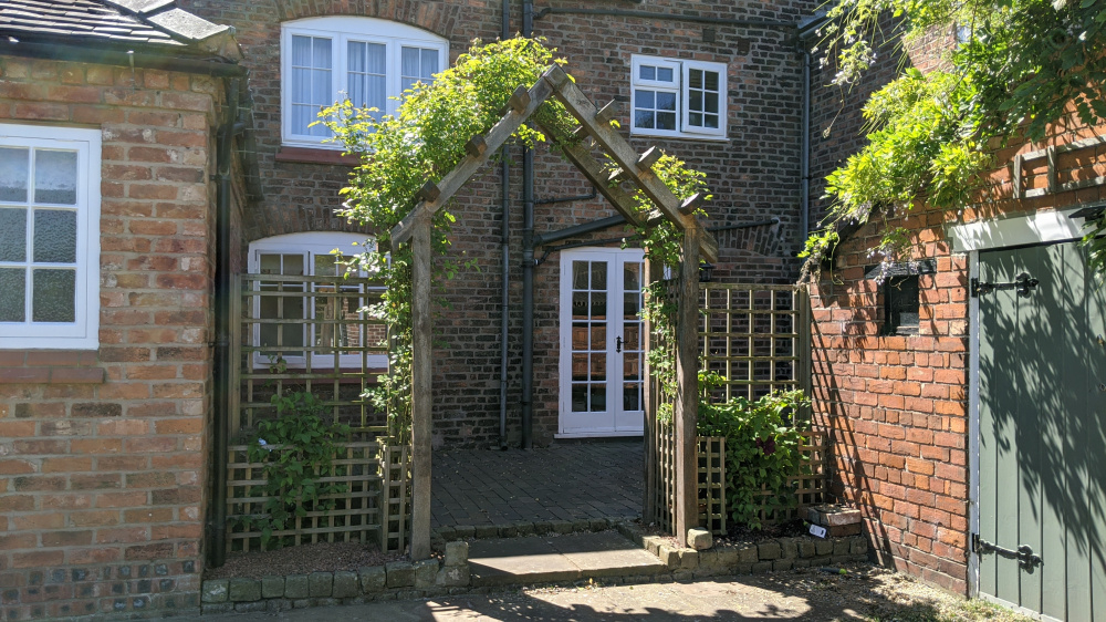 Ideally it'd not be too tall (eventual height around 2m, 3m max as that's the height of the archway) and not necessarily hugely dense, so some dappled light still finds its way onto the patio and the windows behind. Of course, pruning would also be ok.