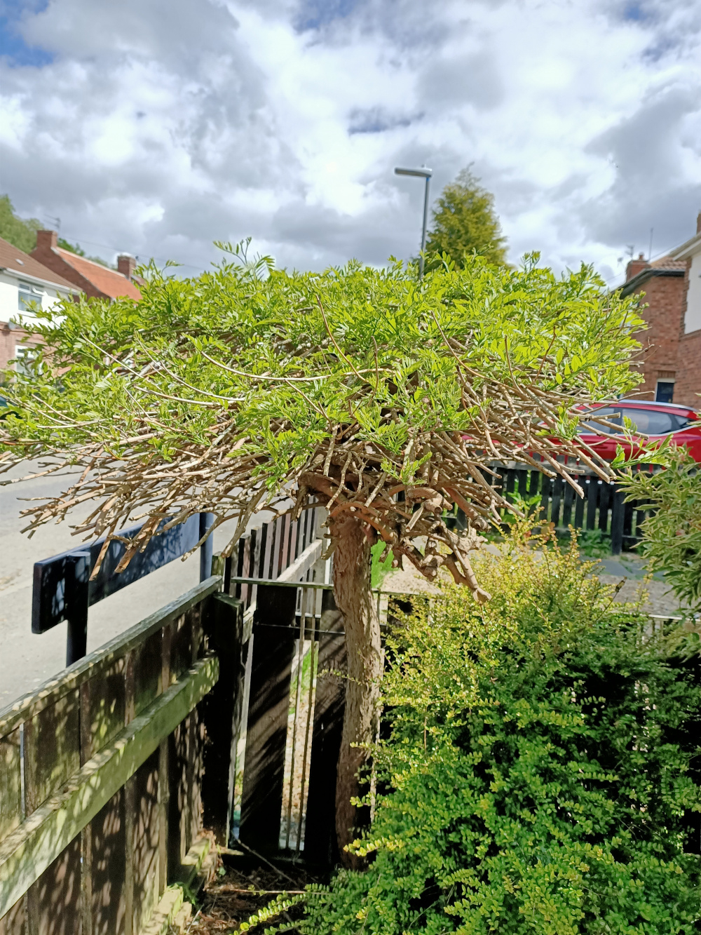 If it is a Gleditsia, and you want to keep this tree, I suggest it is best to let to grow over the next few years and then re-pruned carefully. They have a lovely habit if left to grow, but some can get quite big.