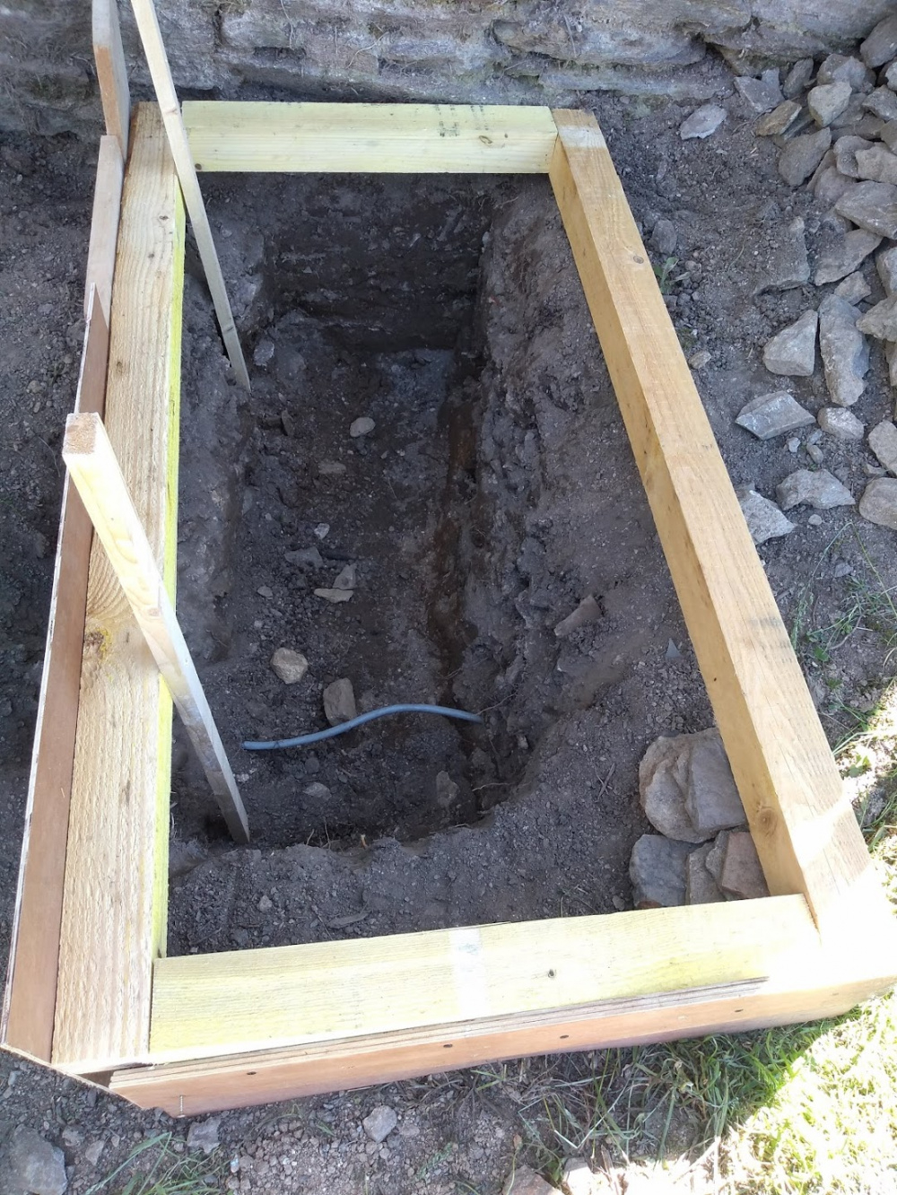 New flowerbed 1 (lower garden) and in the background the wood for the decking and an old oil tank that will be a train for kids to play on (eventually) from leftover decking.