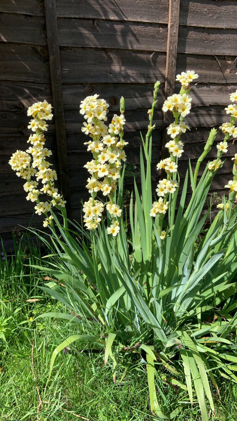 I think that might be Sysyrinchium striatum? @Borderline will know as he suggested it for my border but I've had no luck finding any I can get delivered - so if it is I have plant envy