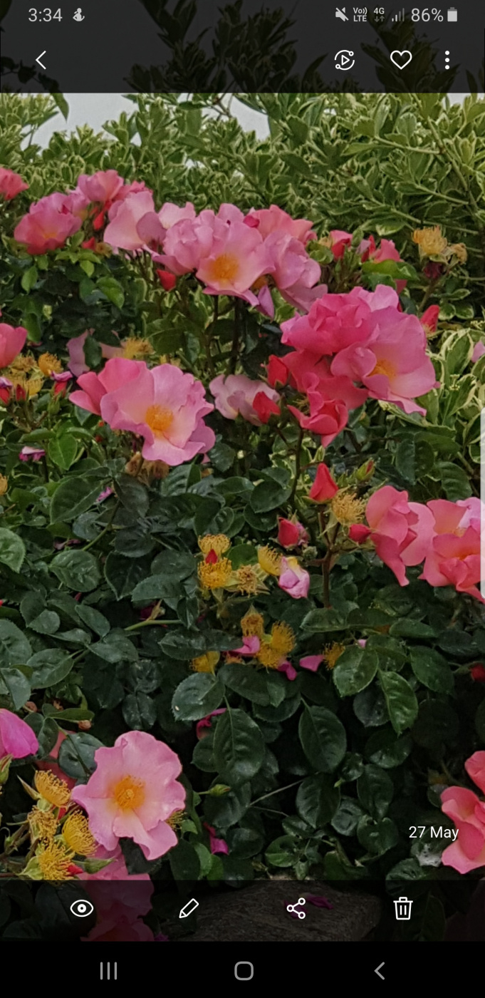 Looks similar to Simple Peach, a Harkness rose. When the petals fall, the remaining stamens stay yellow for a while, giving a nice effect, as shown in your photo.