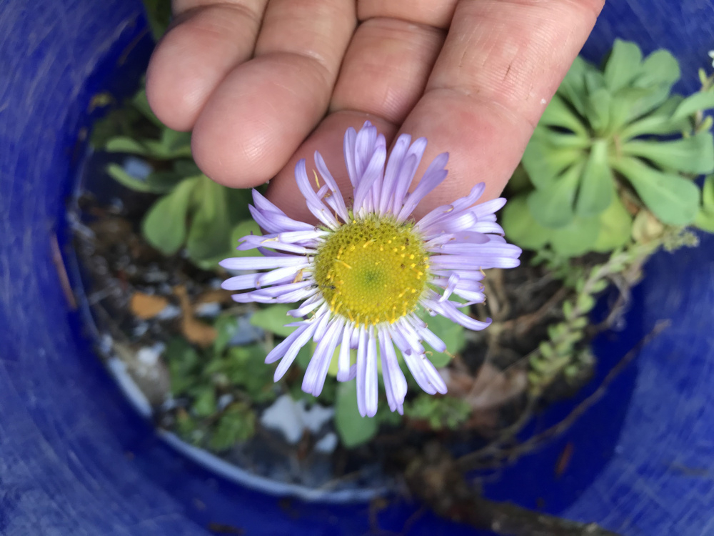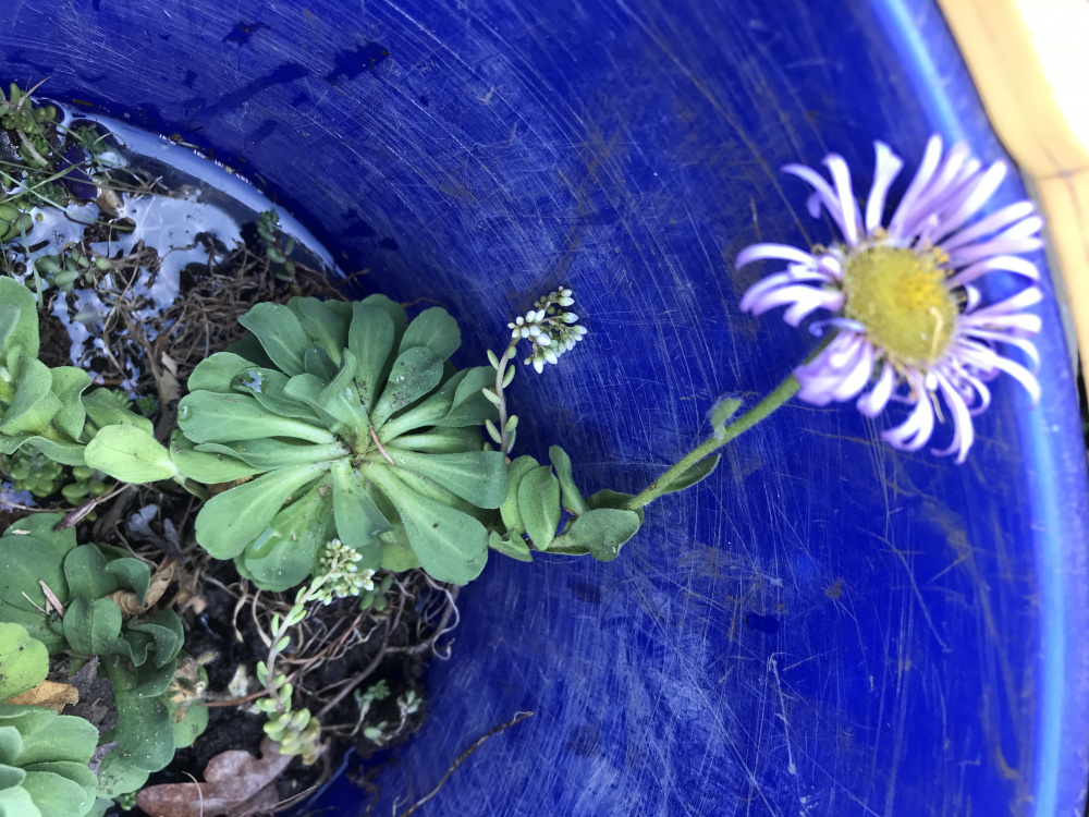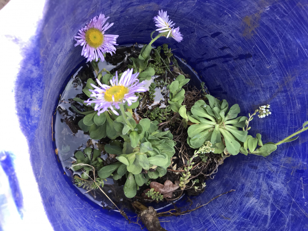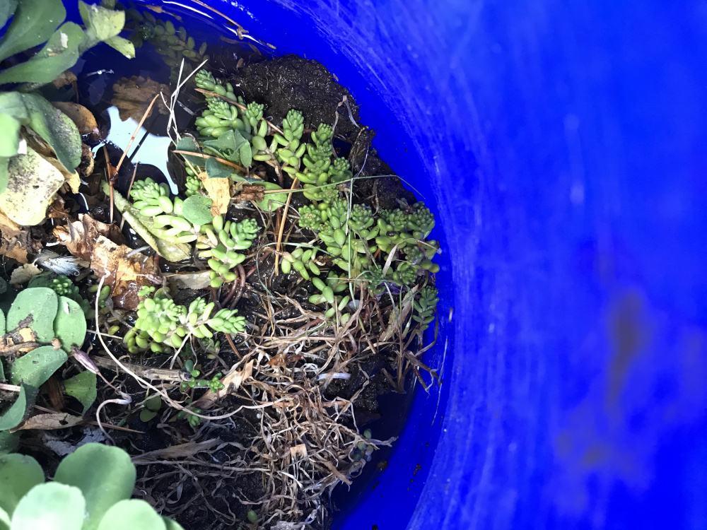 The blue bucket has two plants in it that must have been growing together. First couple of pictures show both plants together.
