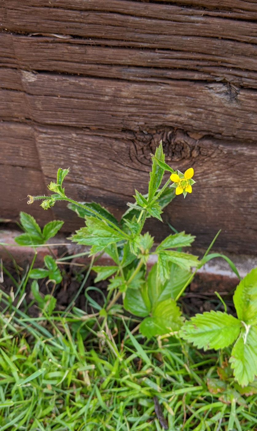 Wild strawberries behind the yellow flower. They can become a nuisance. Some say the berries taste good. Mine don't.