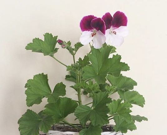 It’s an angel pelargonium, possibly one of the series Angel Eyes, bicolour. The colour of the flowers usually varies according to the amount of sun they get, so it’s quite tricky to identify. And there are lots of unnamed varieties as well.