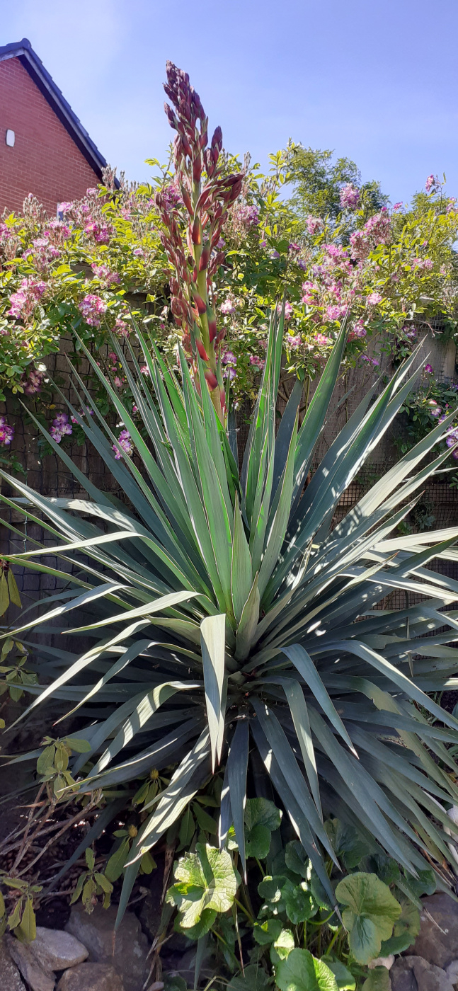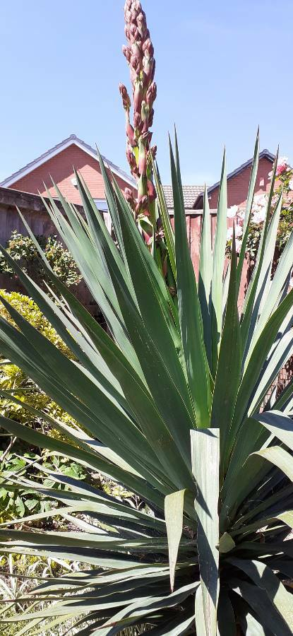 We've had these two plants in the garden for about 9 years. This is the first time they have flowered with a very large spike through the centre with what appears to be purple flowers. The leaves are all green and very sharp at the tips. I don't recall buying a Yucca so wondered if anyone could help identify. I've tried many websites but can't find exactly this plant. We live in Devon and the garden can be quite dry and south-westerly facing. Thanks.