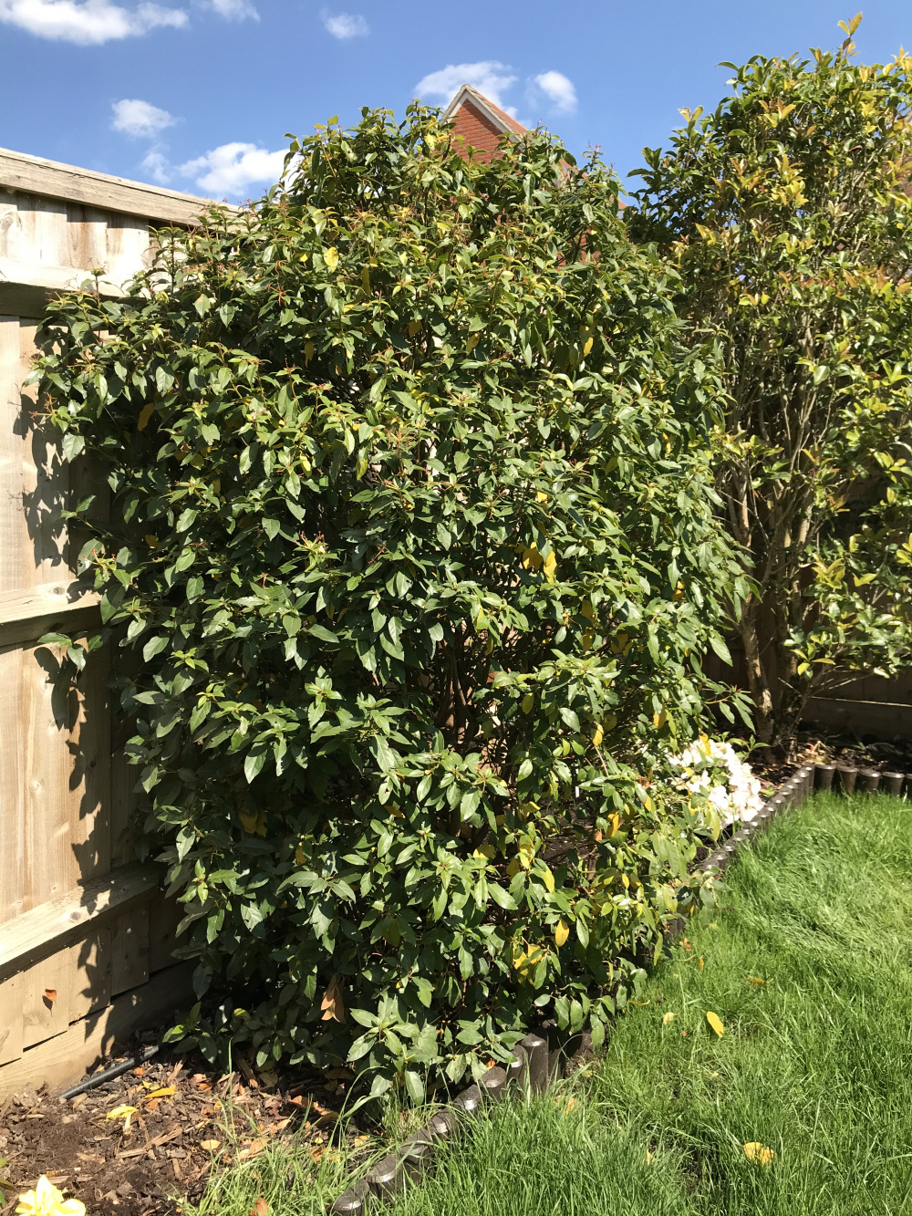 - This year: in March it had some new leafy growth out of the bottom of the shrub. Since it wasn't in-keeping with the shape, I snipped it off. It hasn't really generated any new growth since, and is yellowing.