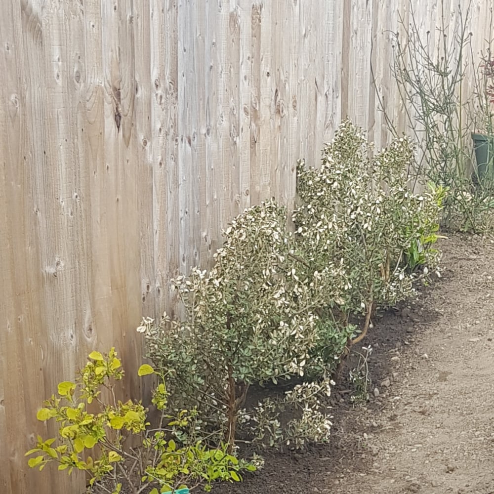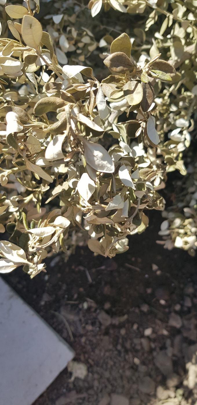 I was given a shrub from a neighbour's garden; it was part of the development's landscaping. It has a woody stem and smallish oval leaves the underside of which are cream (I think it might be a thick bloom). The leaves on the ends were dry and crispy when I got it and rather than improving after re-planting and plenty of watering they are worse, all leaves are now dry. It has gone from a south facing position to east facing so isn't getting more sun.