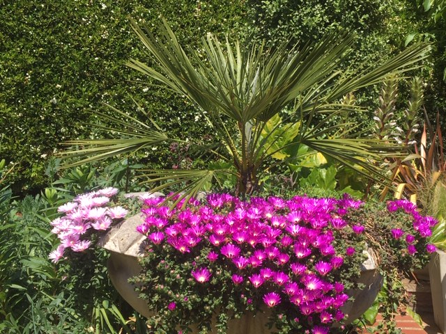 Around our palm we have planted 3 varieties of Delosperma (Lavender Ice, Nubigenum and Cooperi), which is a succulent and very drought tolerant. The Delosperma are not strictly evergreen, but we are in the South East and so we find that they mostly are. They have begun to trail over the edge of the planter, and are stunning when in bloom. This is not the best photo, and the Delosperma has almost completely covered the planter.
