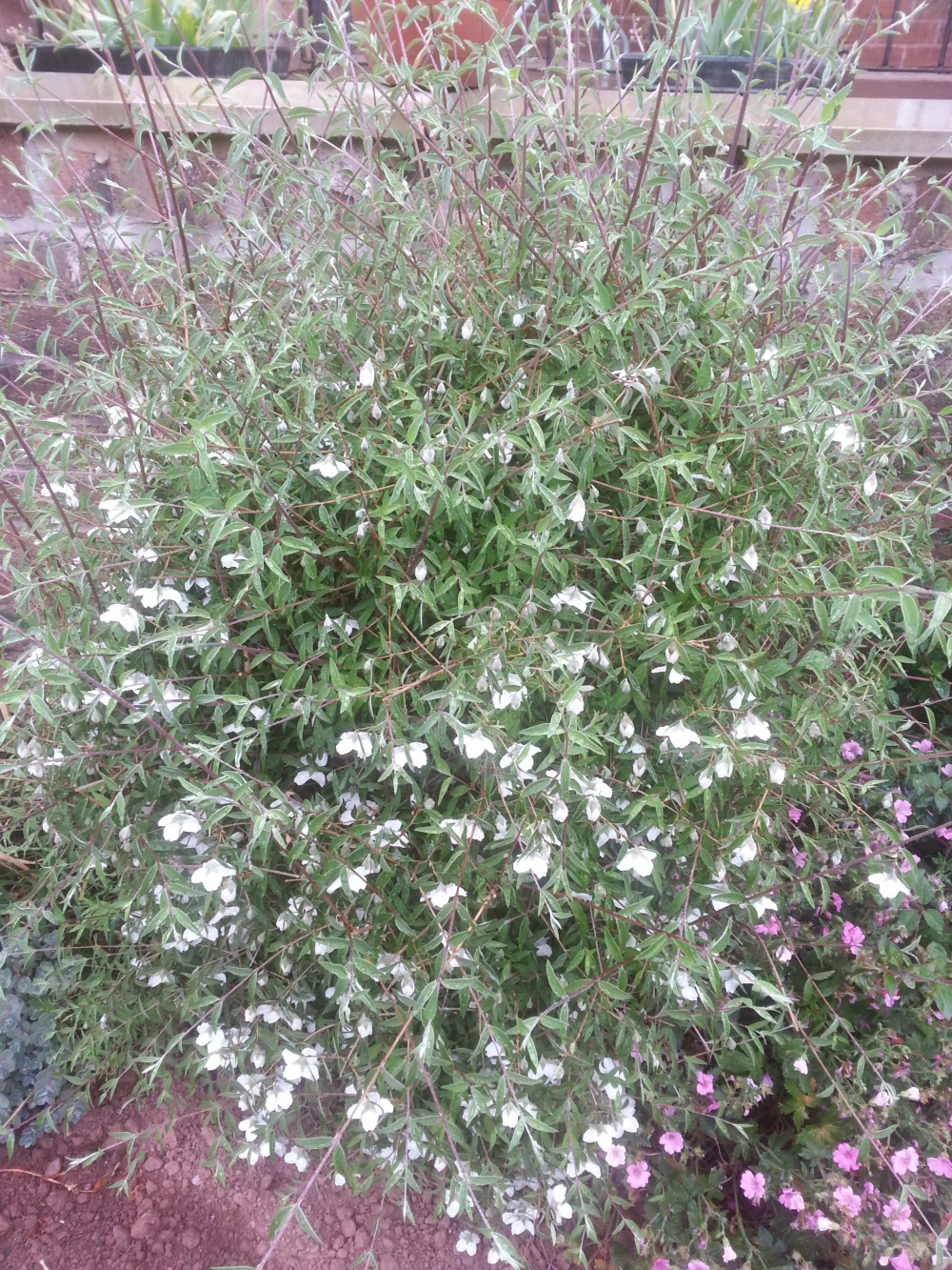 1. Deciduous shrub. Grey/green foliage with white flowers that hang their heads