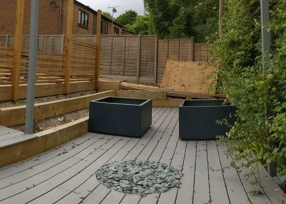 The bottom end of our garden was a sloped area so we terraced it and created a decking area for seating. Eventually I'd like this to be a lush, shaded very green area, bamboo, grasses and ferns, maybe an arbor overhead with climbers. The decking runs kind of N-S with the sun behind me (in the photo) getting lots of sun from around 11am (shaded by the hedging to the right before then) until 2ish (shaded by the cedar screen after that).