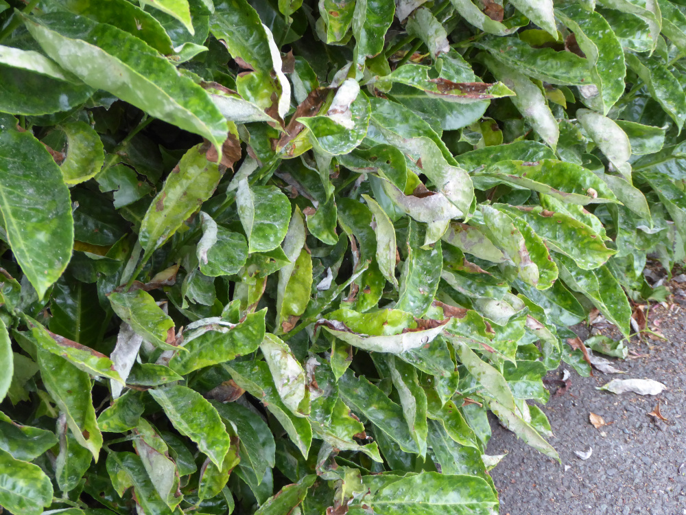 I'm hoping that someone can identify this laurel leaf problem which lines a drive to a park home estate where I live. I would only want an environmentally way of treating it. Thank you.