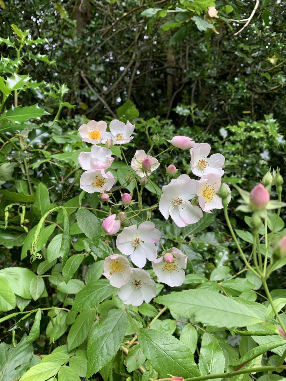 @fidgetbones thought you would be pleased to see that Rosa Fidget has produced its first spray of flowers for me. Ā It is currently romping away up a holly tree. Ā Very pretty blooms š. Ā