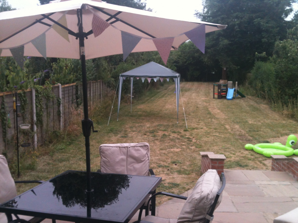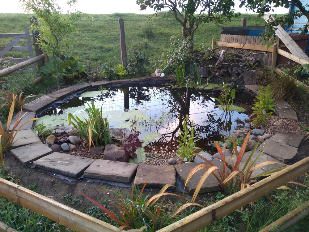 Since the during photo we've extended the patio, I added in a lawn circle (need to fix the slightly flat circle!) there's a raised bed opposite the shed which currently has squash, courgettes, and climbing beans in it. Soon I will have a tree in a pot at the back, and trellis added to the fence, and the climbers you see in the last photo will be trained along the trellis! Pot saucer in pond courtesy of yesterdays gusts!