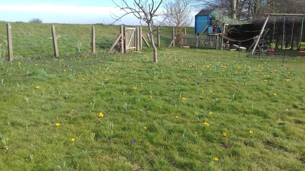 Our 1st year seeing 2000 bulbs we planted emerging, the area between the gate and the blue building is now our pond