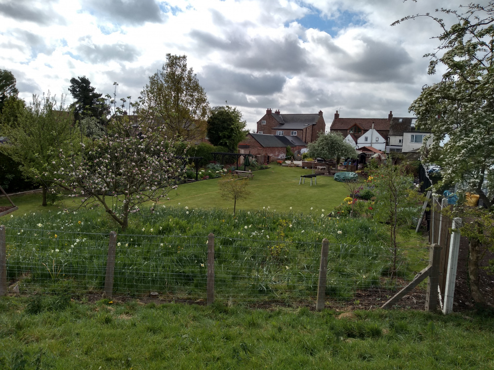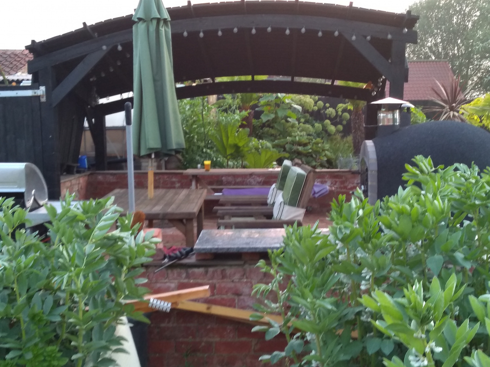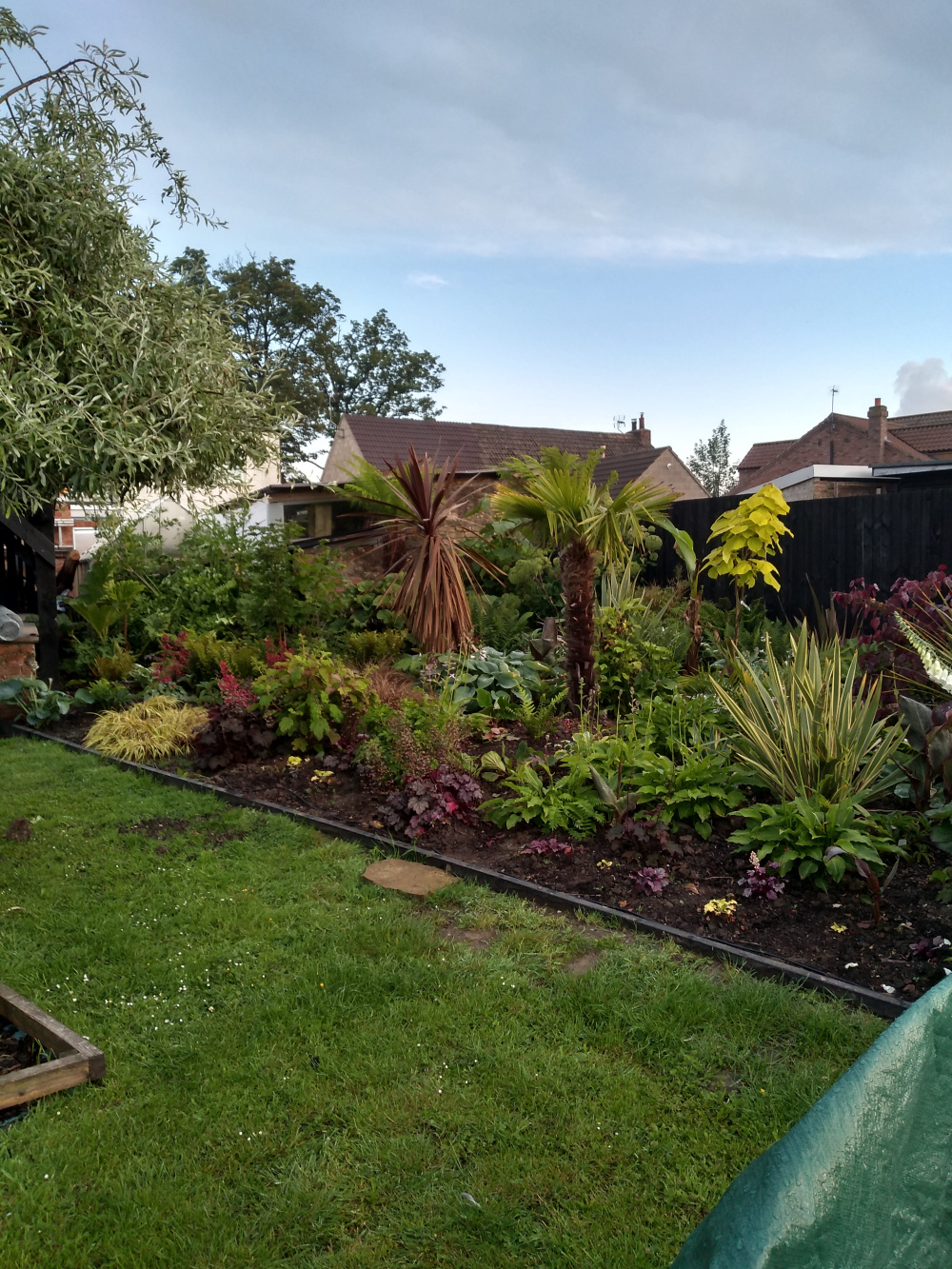We gained our extra chunk of garden in September 2017 it was a totally abandoned space roughly 3/4acre large veg bed with huge piles of rotting grass clippings, a hedge that had been allowed to grow 3mts in from the boundary, 50 ton of rubble in 1 area, a building that was collapsing and a fence that allowed cattle grazing behind to enter the garden.our 1st bed planted Pergolas being added veiw down the garden Our 1st year seeing 2000 bulbs we planted emerging, the area between the gate and the blue building is now our pond We removed the collapsing building and built this structure Which now is home to our dinning area This is a view from 2018 and from now Our tropical area The 1st beds 3 years on A view from the footpath behind. The boundary hedge on the right side was as deep as the beds we introduced. We were absolute beginners when we started and have learned to grow our own plants by seed, divisions, cuttings etc and produced thousands of plants to fill the space.