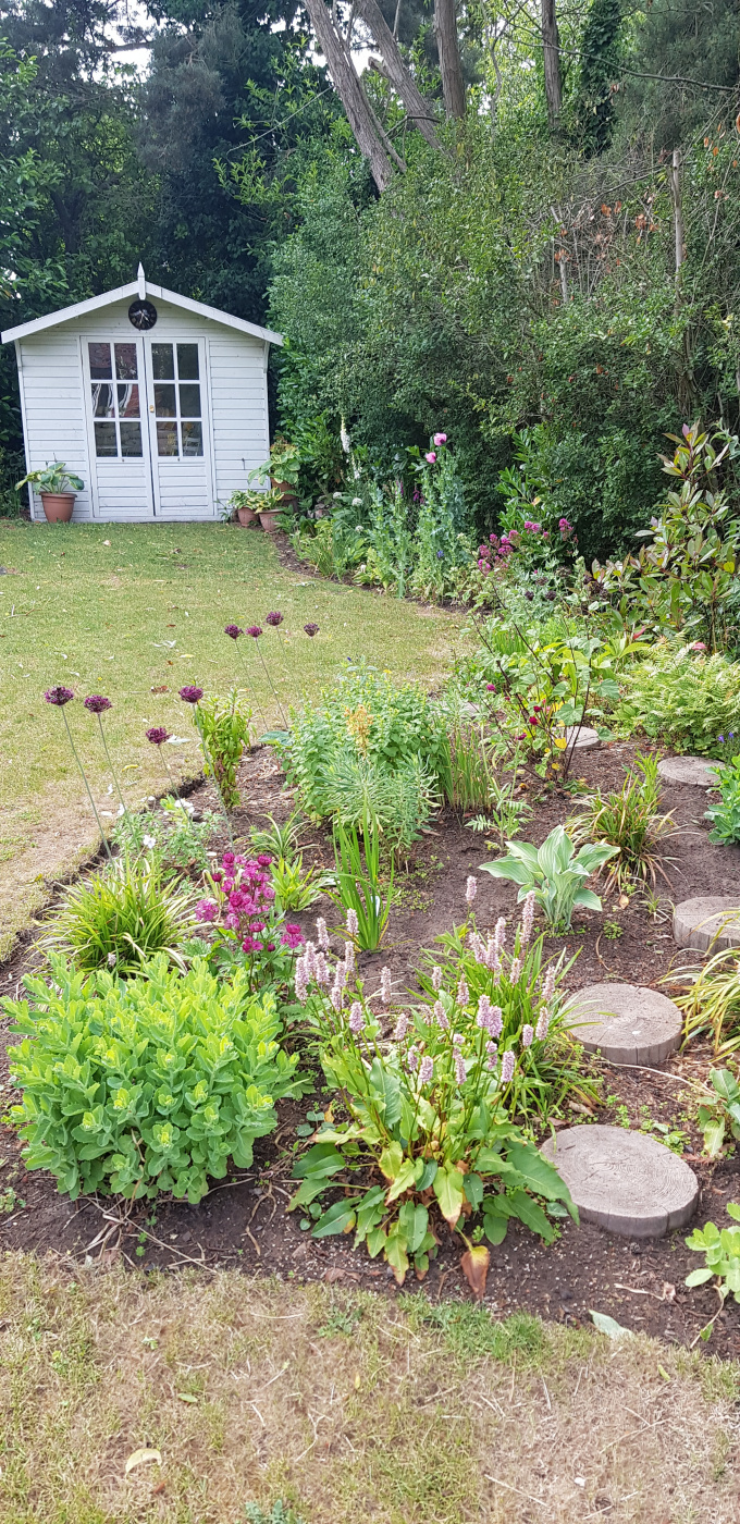 A view from the footpath behind. The boundary hedge on the right side was as deep as the beds we introduced. We were absolute beginners when we started and have learned to grow our own plants by seed, divisions, cuttings etc and produced thousands of plants to fill the space.