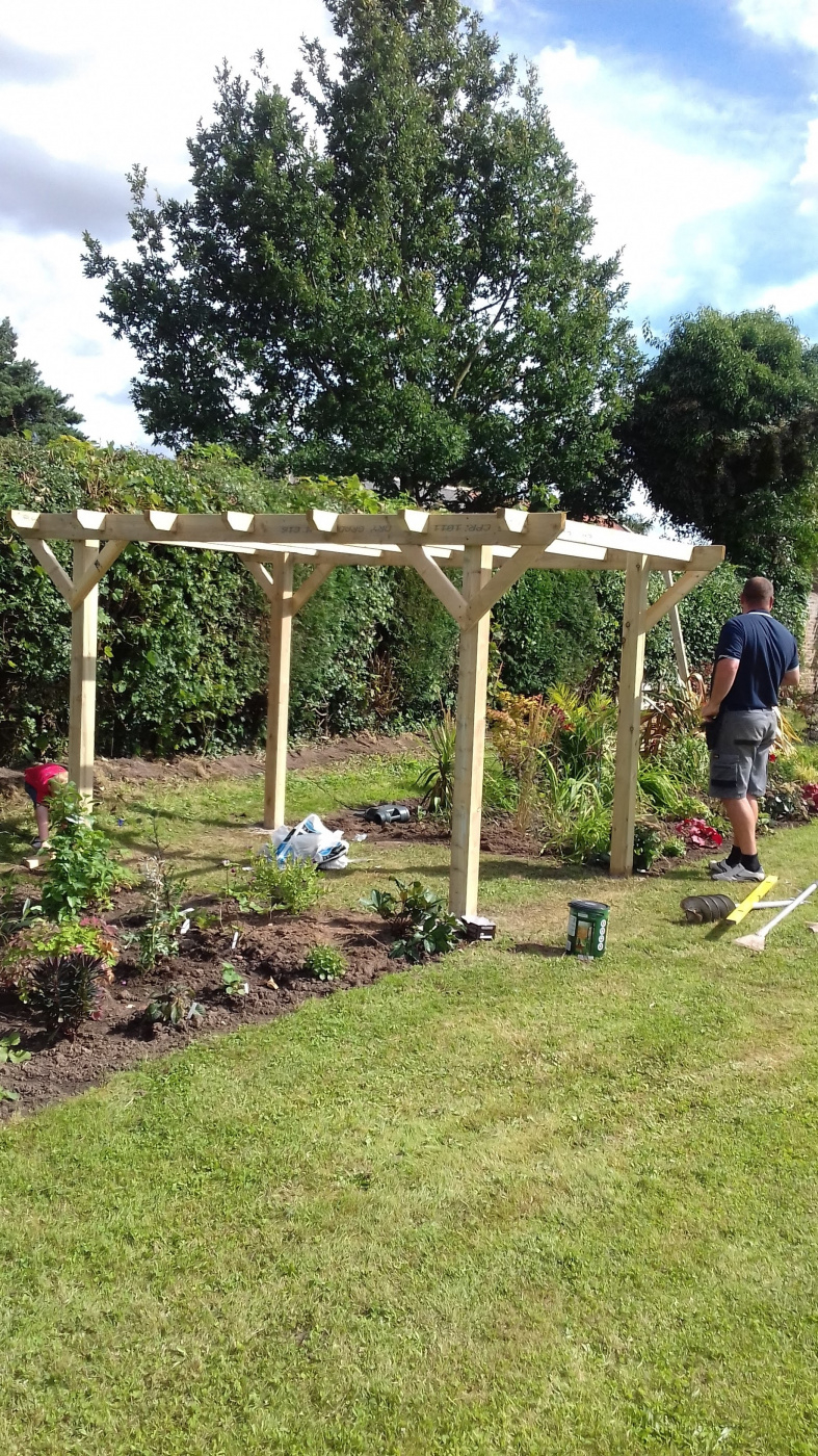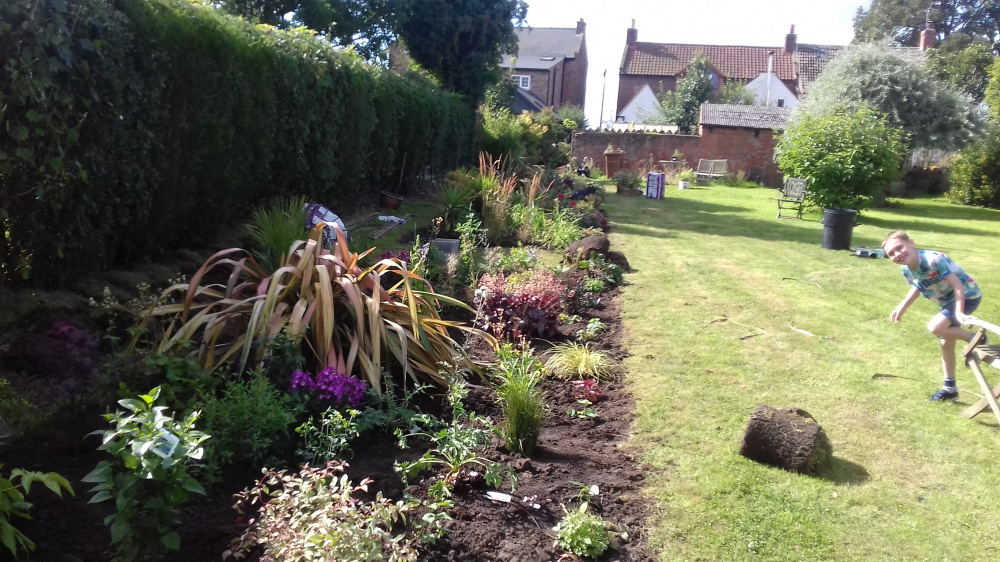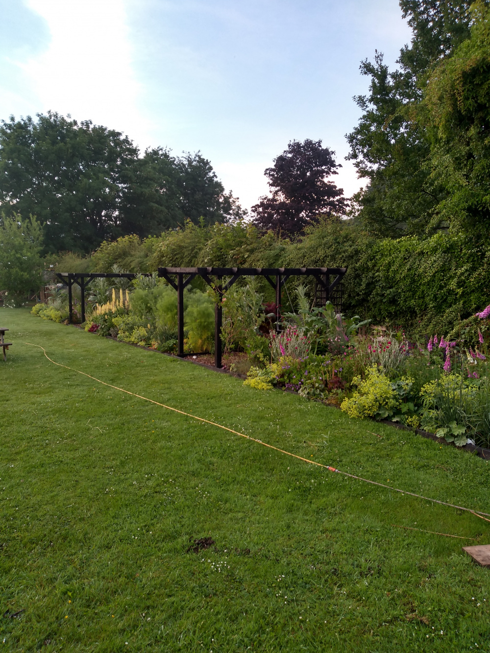 We removed an entire skip of clay (and one newt) kept the height the same along the left and back as our neighbours garden is higher and we didn't want the cost of putting a proper retaining wall in, which is why the flower bed is where it is!