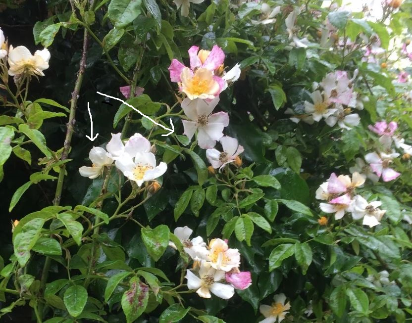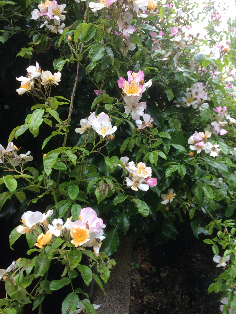 Can anyone identify this rose for me? The flower buds are apricot/yellow, opening to white then going over with a blush. Slightly fragrant. It's huge and covers a garage so I presume it is a rambler.