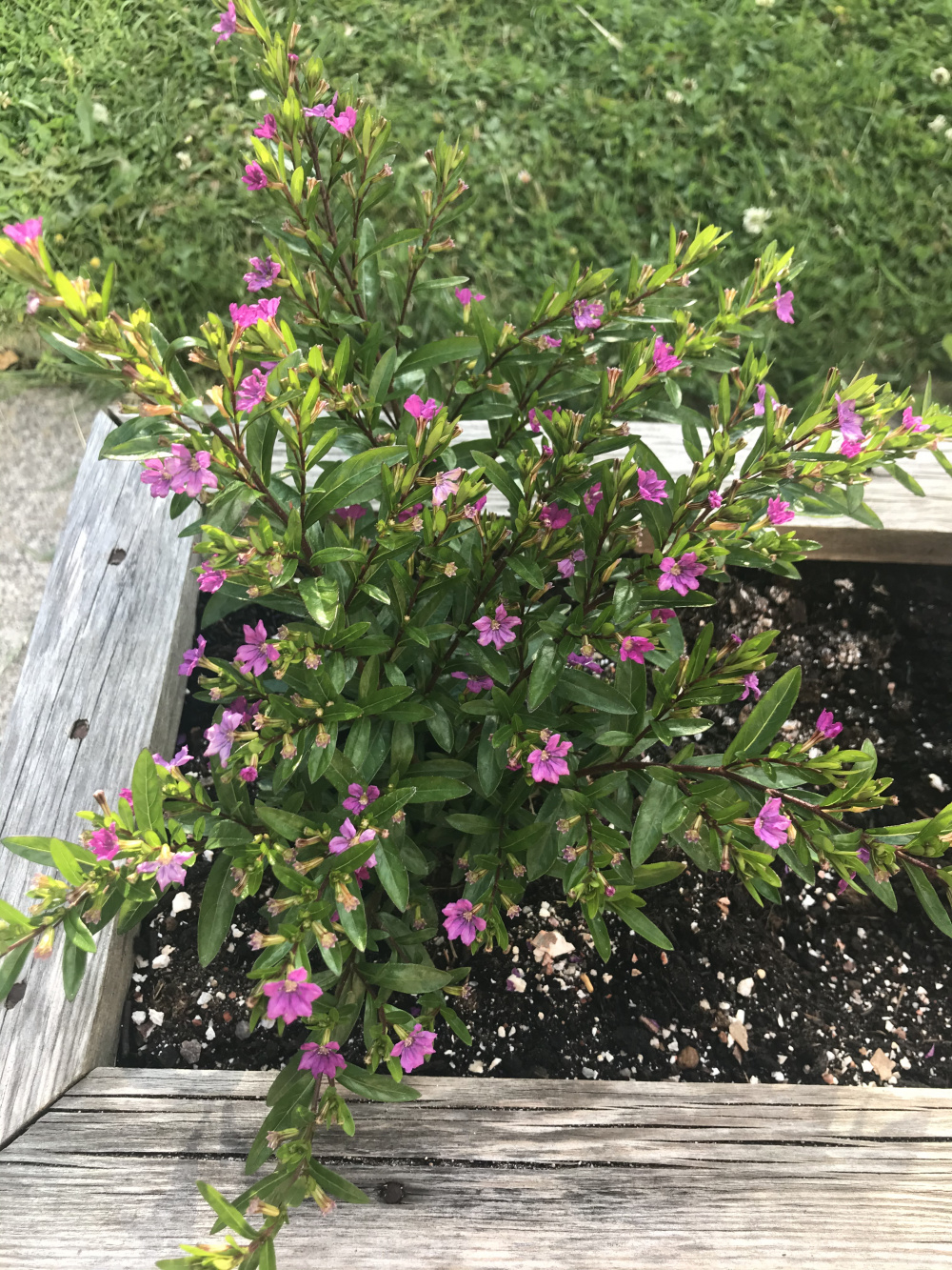 I think that might be a False Heather shrub, Cuphea Hyssopifolia.