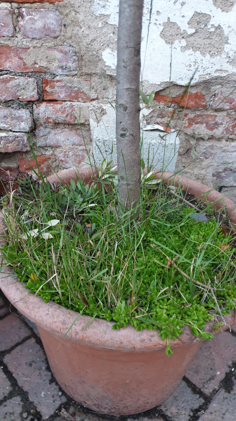 Excuse the state of it. A very unloved tree that needs some TLC. Succulents are under the rampant grass.