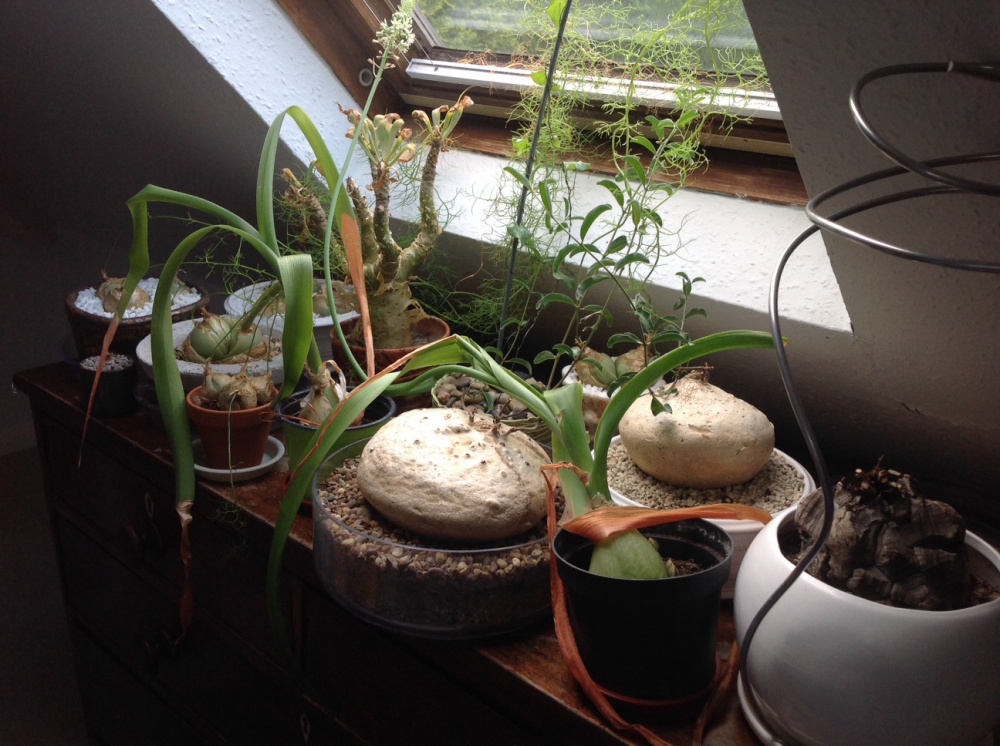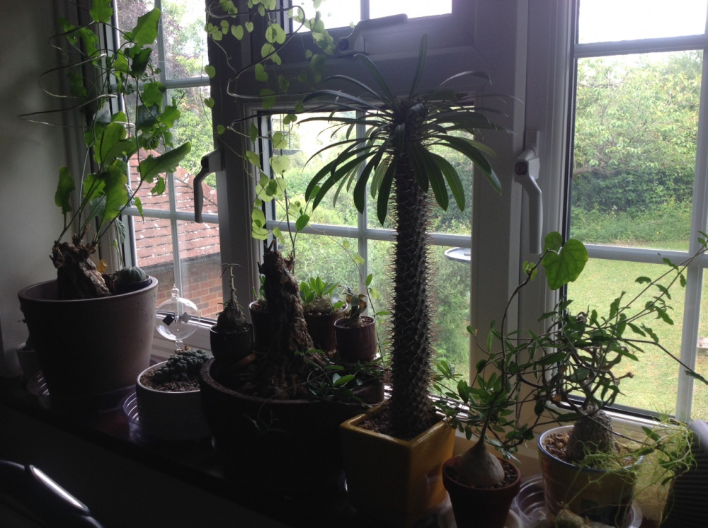 Next large pot may be another Dioscorea sp. Little brown pot nr. window may be Pachypodium brevicaule ; next , tall grey spined plant is Pachypodium lamerei (Madagascan Ghost-tree)'.
