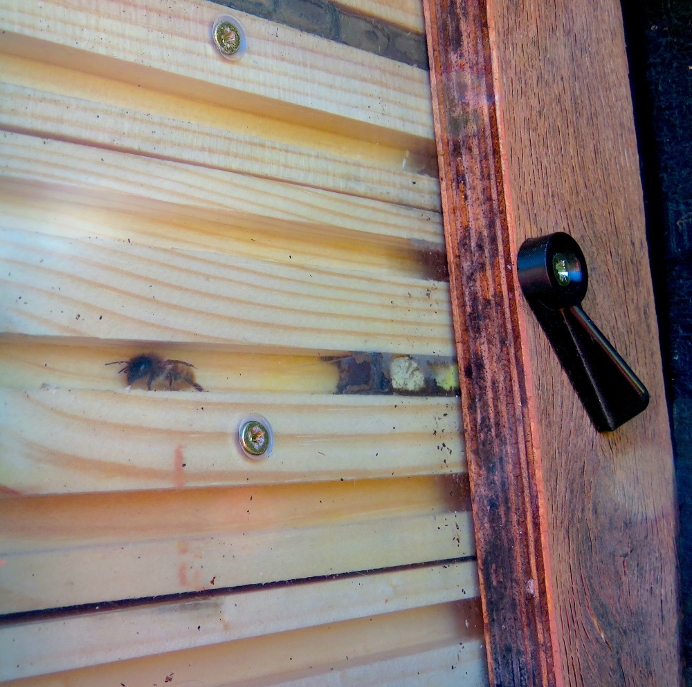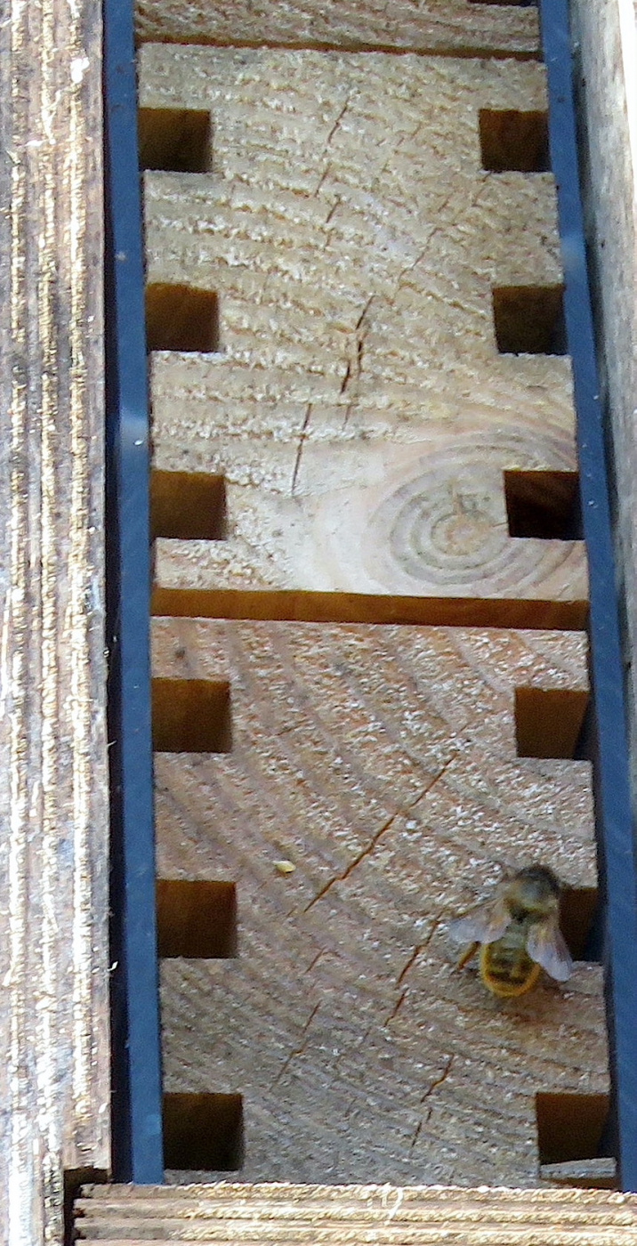 It was hard to see (or know) the species but they seemed to be leaf cutters (not very furry) and mason bees (pretty furry). I was interested to note that when investigating the boxes, every bee started exploration (I imagine by smell) from the box holes up, never top down. I imagine they map in a very particular way.