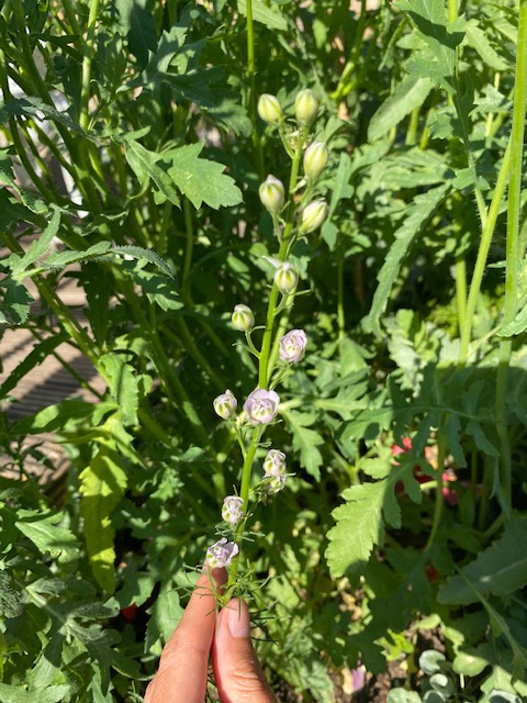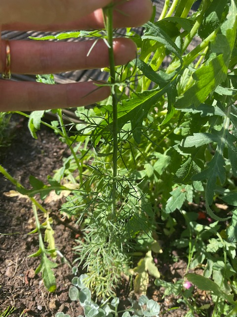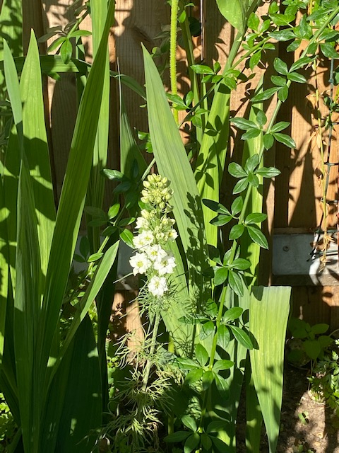 Have seen this little feathering foliaged seedling appear in front of my poppies and another in front of my gladioli. I had originally thought it would be a Nigella 'Love in mist.' However now I see that all the buds are forming alternately around one single spike. I have googled Nigella a lot and I don't see this kind of flower formation. Whatever it is it's really quite pretty, but I wonder if anyone can tell me its name? Thank you all!