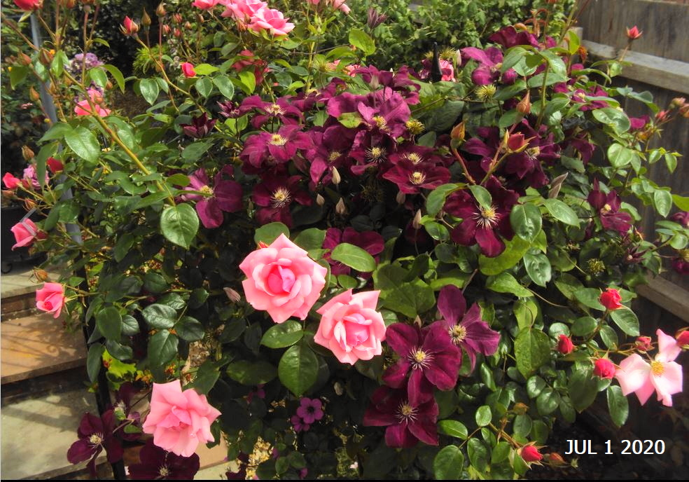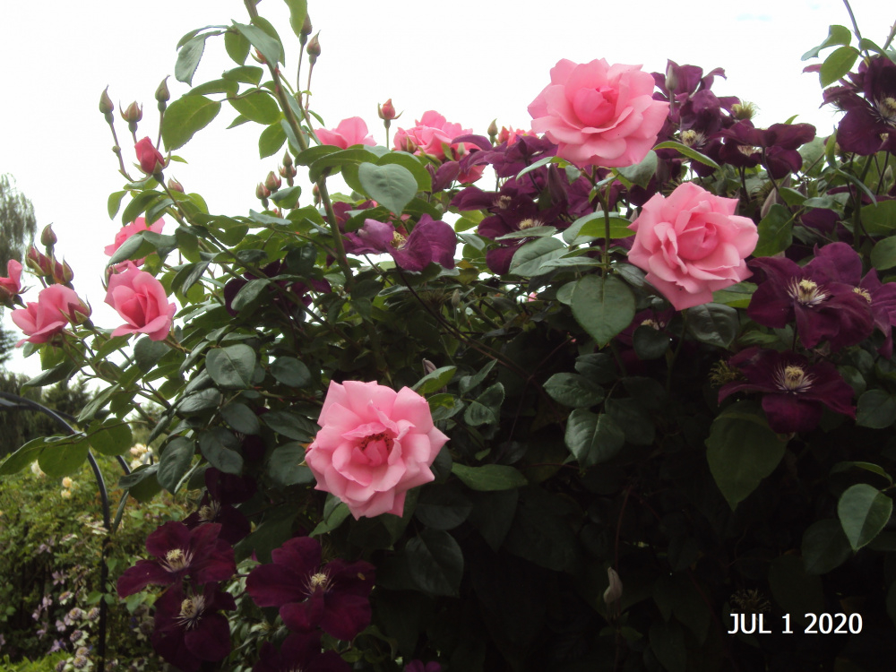..with purple/red 'Niobe'.. I think any light pink rose in the 6-8 foot range, looks nice.. this is 'Armada' a clg. floribunda rose..
