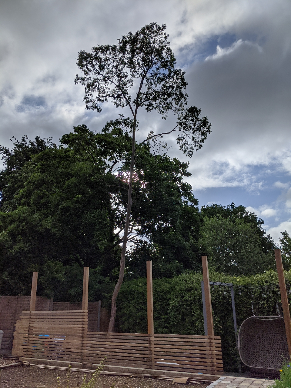 Here's the Eucalyptus, I think we already jumped the ship with that one! It was here when we got here and although it's not the greatest example, I kind of liked it. It bends around in a storm and scares my wife! But it is also the perfect roosting place for pigeons and parakeets who like to decorate my decking 😒 so it's swings and roundabouts.