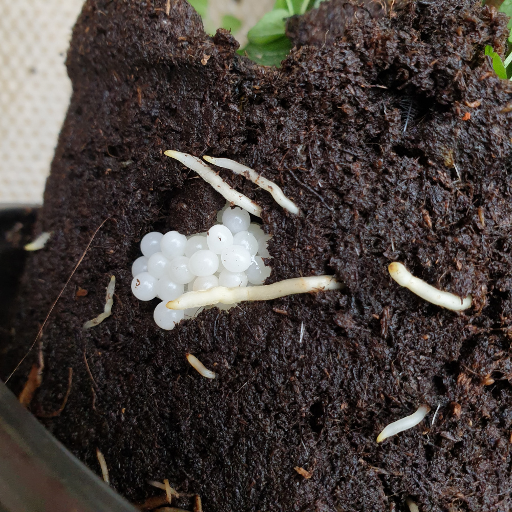 I do not know what. It's stayed, happily, in the pot I bought it in for a couple of months but today finally ready to pot on to final position, found this? There are food balls, yellow, dotted through the soil. This looks like a clutch of eggs. Or maybe my brain is looking for nighmare scenarios. Any ideas please, and if it's a pest, recommendations of kind management gratefully received. Thanks so much!