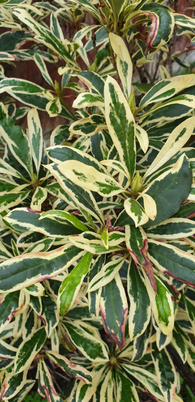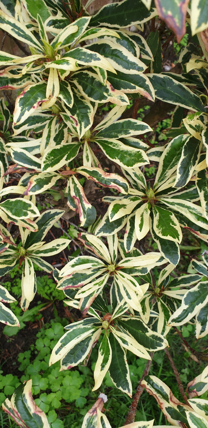 The variegated branches should bear pink flowers...but not until next spring.