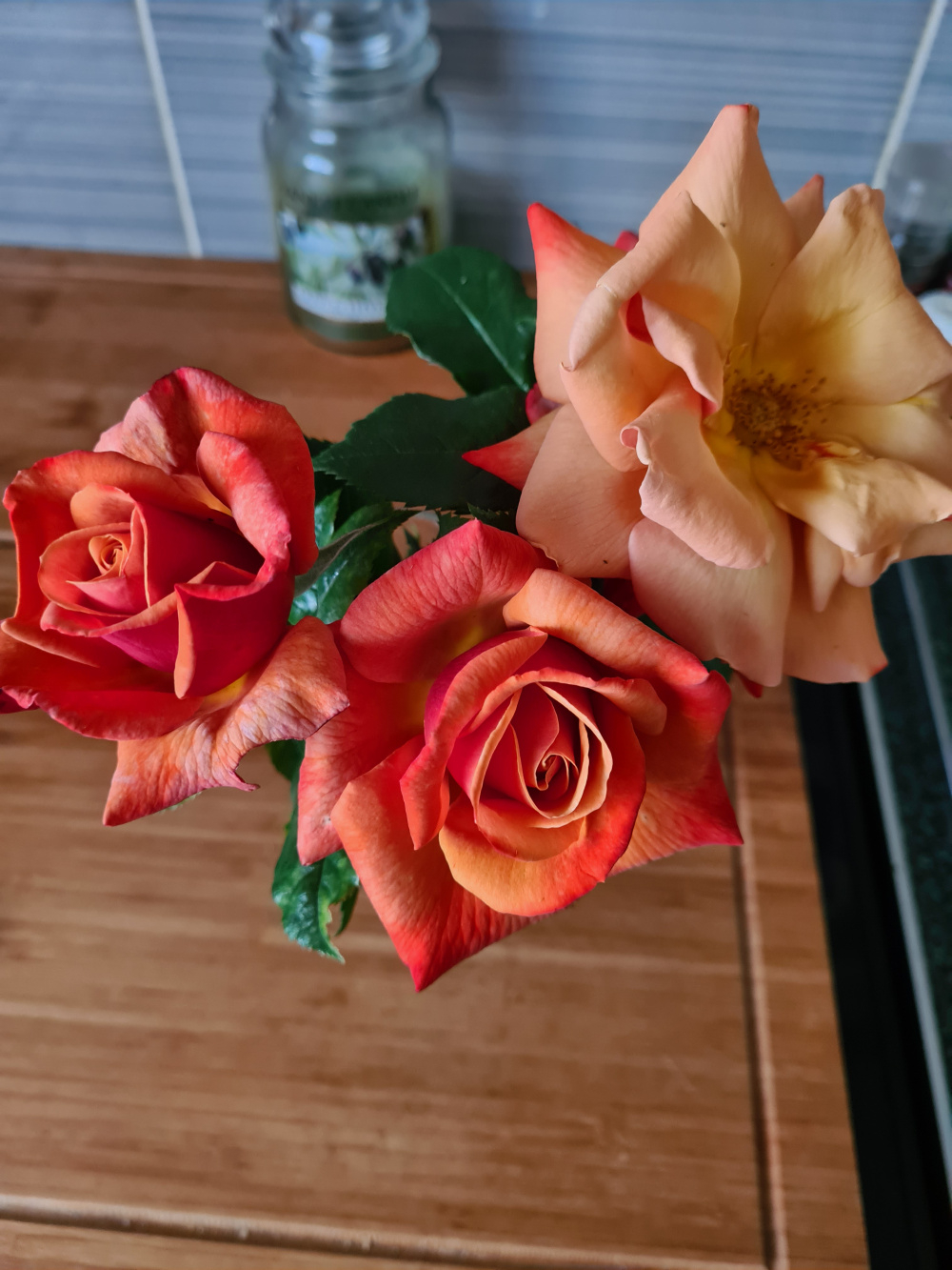 The roses produced start off almost red, then the colour changes to red-orange streaked colour then to a peachy colour and they smell like Parma Violet sweets (although the last ones were full of earwigs 🤮) and are fairly large flowers but we only get about 8 a year and this year they arrived about 2 weeks ago and the last one dropped off this morning.