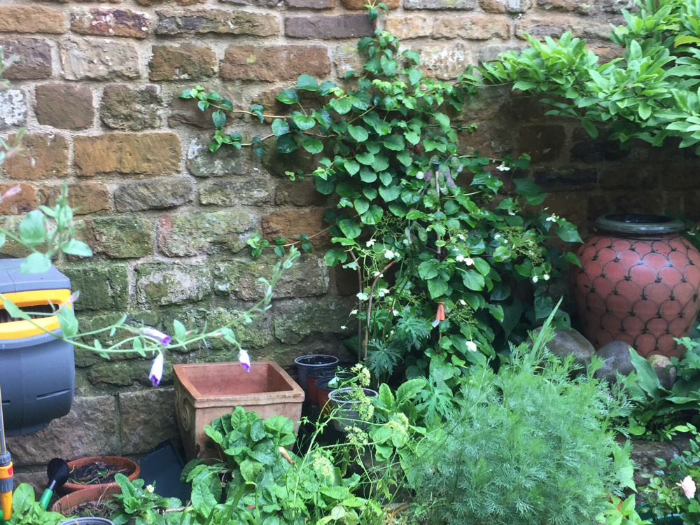 The 2nd spot is in a large container in a corner against a south facing wall in a sheltered position. When the sun is shining, it gets full sun until late afternoon. I would like a flowering evergreen climber, to grow up and along, above a window but nothing too vigorous. I have removed an old trachelospermum jasminoides from that container. The container in front/next to it has a variegated jasmine that is in flower now and is being trained up and along higher up. Under the window and next to these containers is a raised bed.