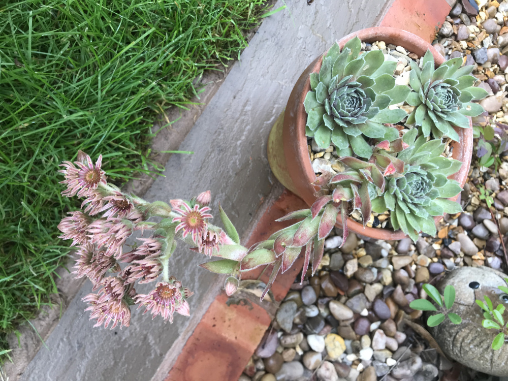The top picture shows three different varieties all potted together. The flower stem on the right comes up from the top cluster. The flower stem on the left comes up from the left hand cluster. The variety on the right has not flowered. All three varieties have many offsets, are they safe? Will the offsets need removing and repotting before the flowering sections die?