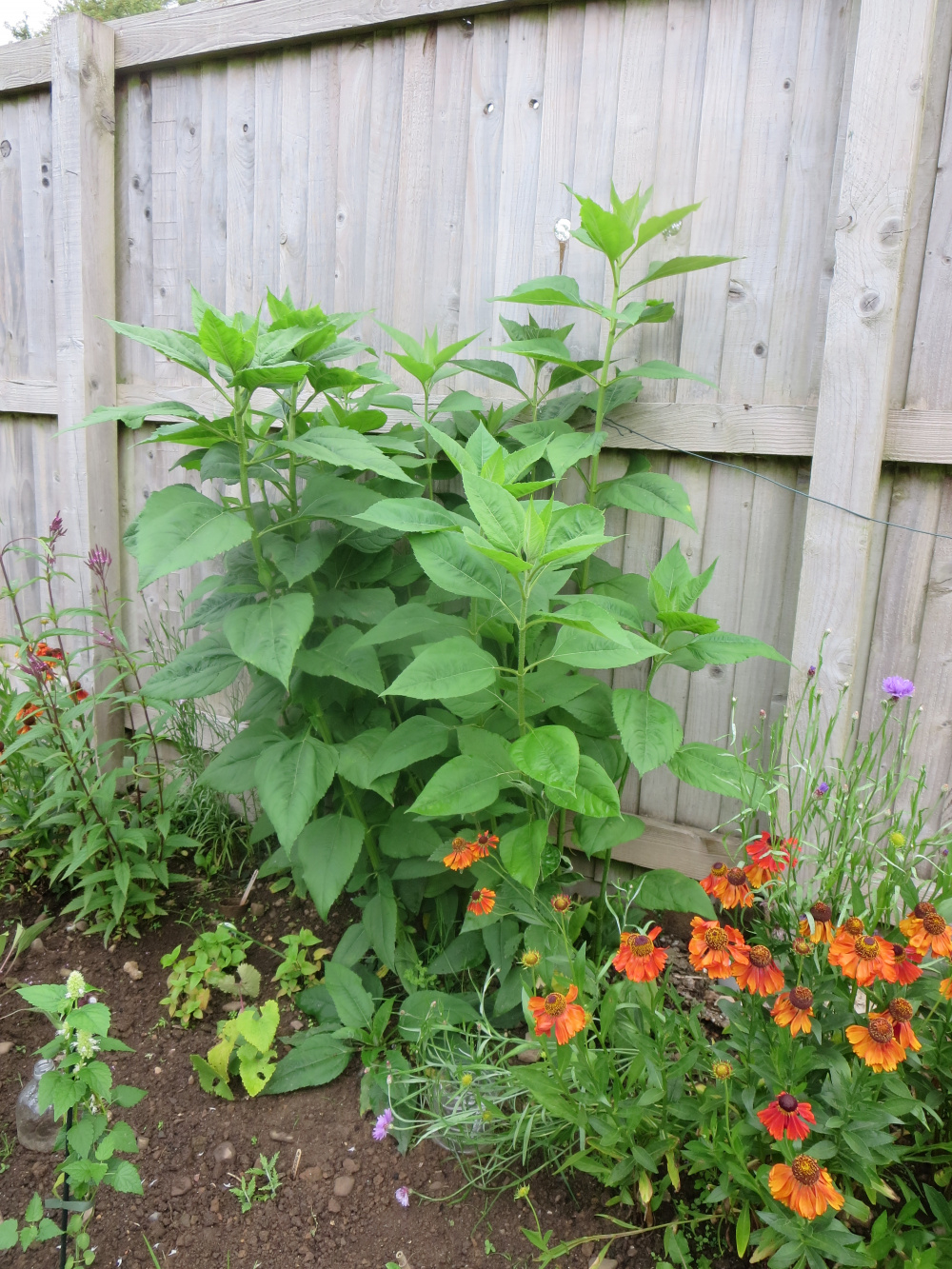I refer to the tall green plant by the fence. I planted Nicotiana Lime Green seeds in this place and was quite happy initially to see leaves growing. However, it's growing and growing but no flowers appear.