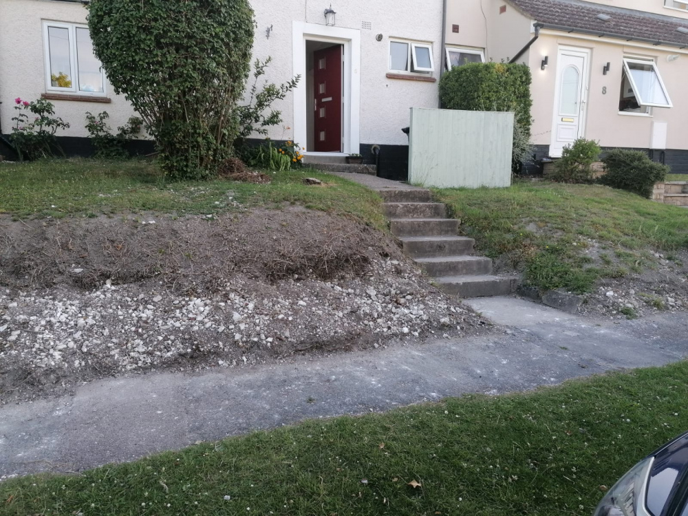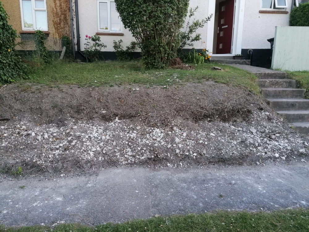 Recently removed our old hedge along the frontage to our front garden. The front garden slopes and there is a hedge to the left with our neighbour and a garden wall to the neighbour on the right.