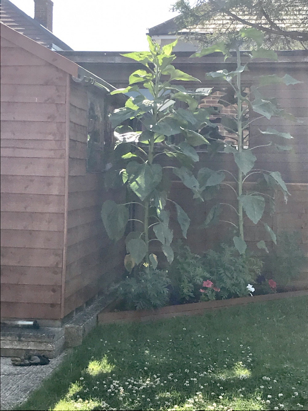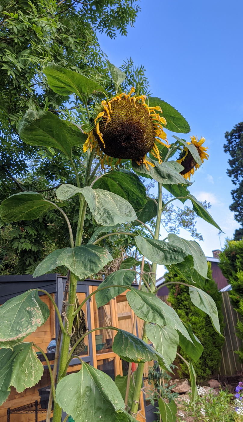 I'd never grown them before so planted them probably too early but got away with it thanks to the warm spring. The first one out wasflowering in early June and is now a dinner plate sized seed head. These two are about 9ft tall and flowering now. The closer one I think maybe has some fasciation as the petals are all narrow and the face of it is curling back on itself. Lots of fun!