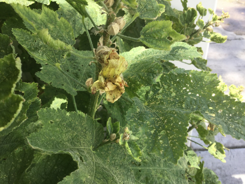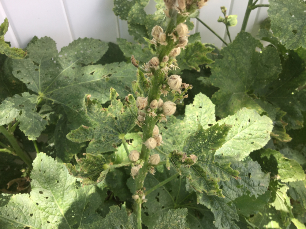 I need some suggestions for a replacement for a row of hollyhocks. I've been dealing with hollyhock weevils for the past few years.. and have followed the recommendations of cutting off and throwing away seed heads as soon as they finish flowering. I threw them in the trash to get them away from my house. This year the flower heads shriveled up to nothing and 90% never came close to blooming and those that did look sickly. I assume it's a weevil issue as they were fed and watered from spring onward. They bloomed fine every previous year.. but the problem is across the entire row. So this fall I plan to dig them out and replace them with another tough perennial or a self-seeder.