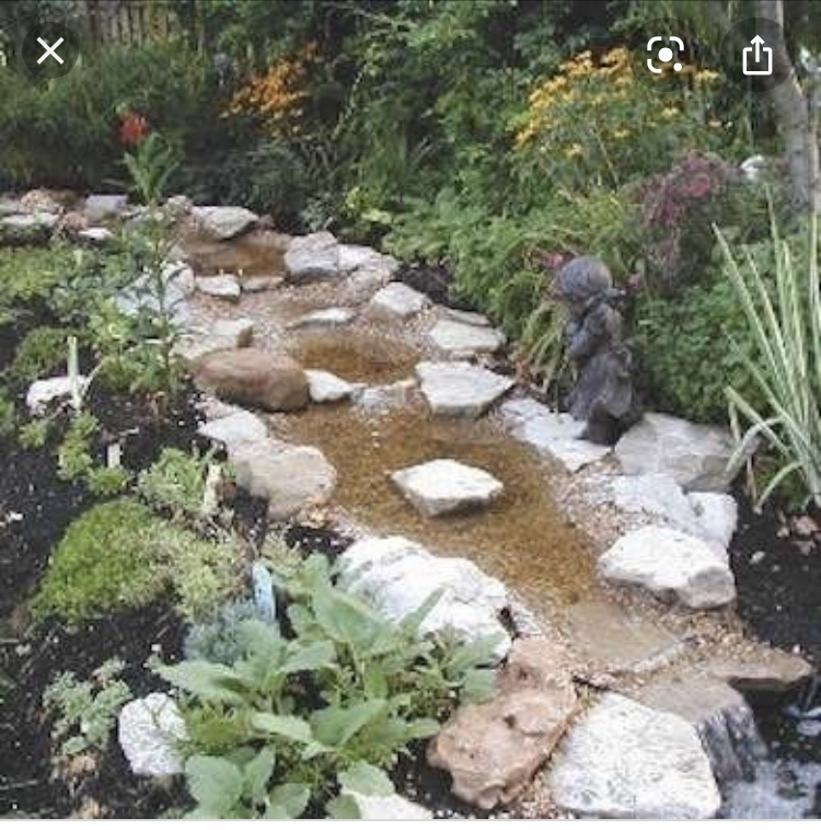 This is kind of similar to what I was thinking. You could do a stone path between the doors. They look like they’re different distances from the back wall, so you could do a straight diagonal or a curving path. If the path is straight, you could do like a dry riverbed look with a little ‘waterfall’ parallel to the path. If you make a curved path, you could do a round water feature.