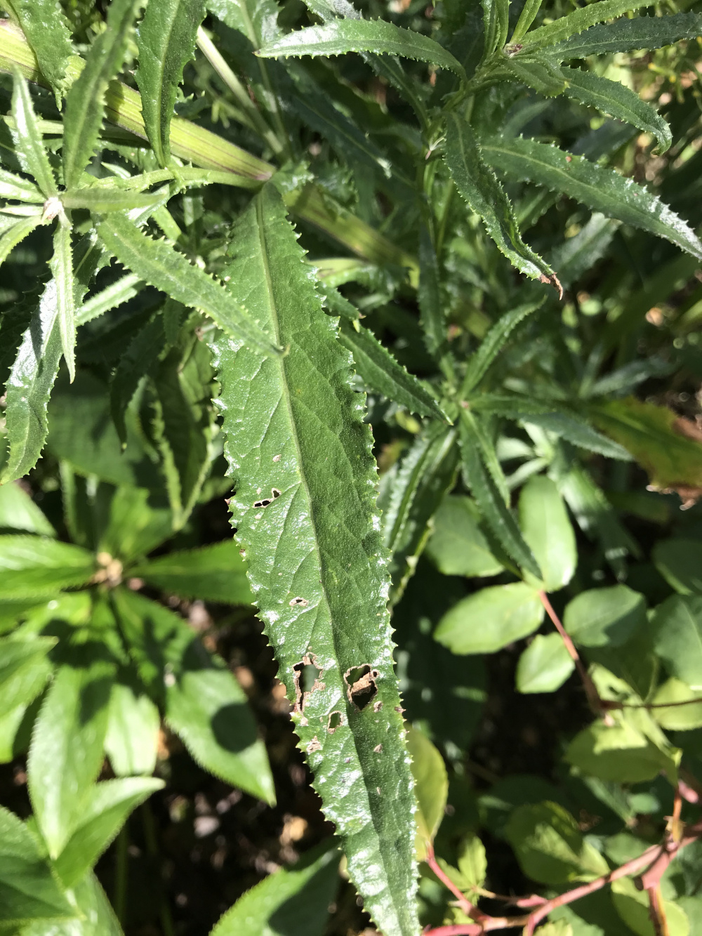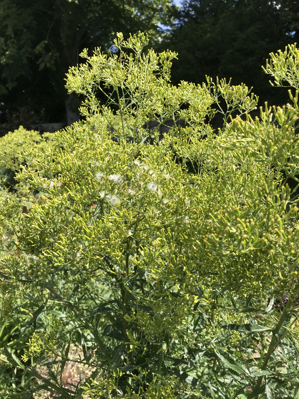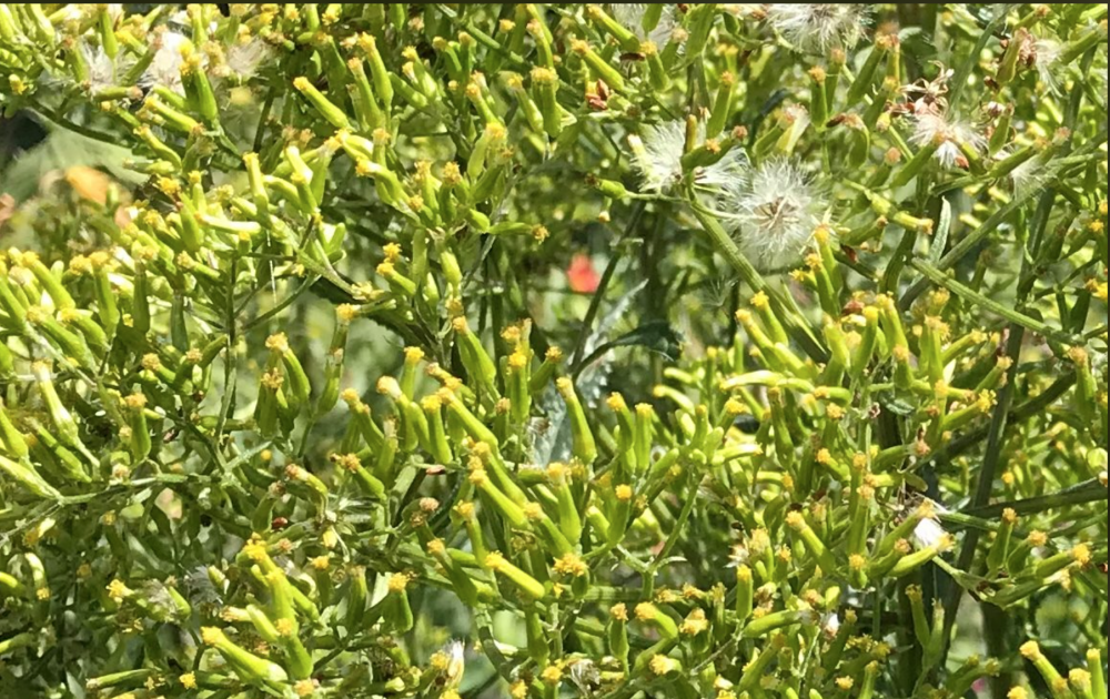 Please can anyone identify this very tall plant that has suddenly appeared? The 'flowers' are tiny, about 5mm, tubes with a minute yellow bud that turns into a thistle type seed.