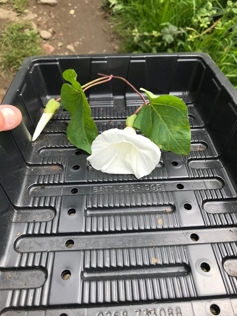 Bindweed convovulus arvensis. Its in the Morning Glory family but unfortunately it spreads like wildfire.