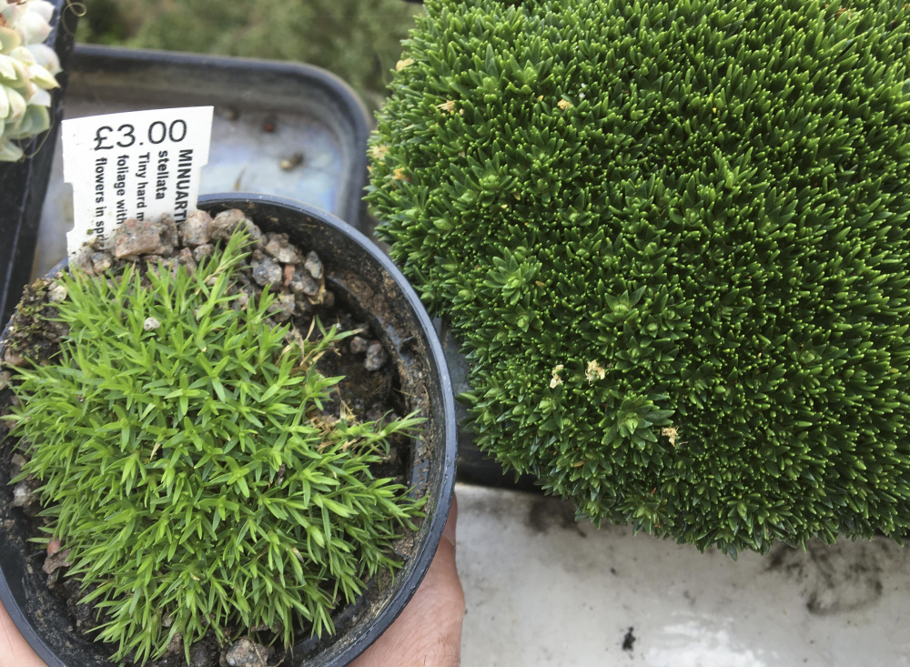 I am trying to identify the plant on the right of the attached photo. The plant is similar in appearance to minuartia stellata but the leaves are much more rigid and waxy. The whole cushion is very dense and rigid. Flowers are pale pink, aprox 5mm in diameter and form on the surface of the cushion. I have included minutia stellata in the photo as a comparison. Many thanks.