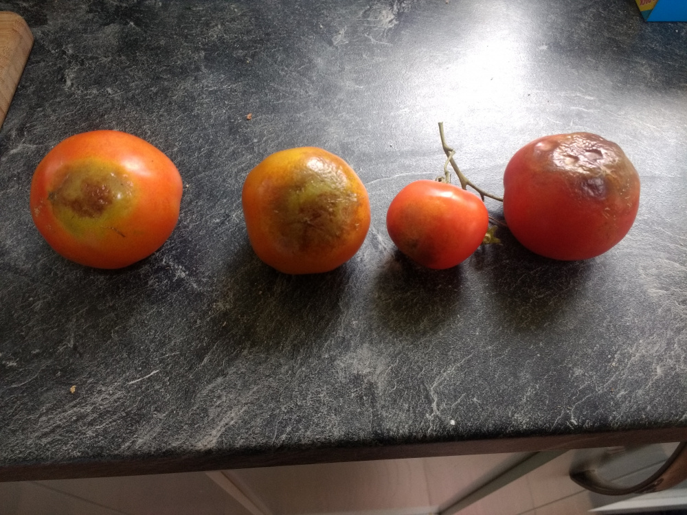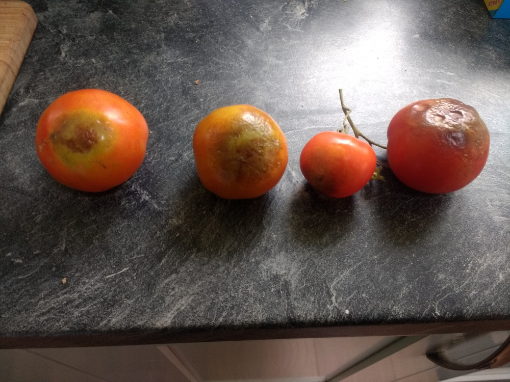 This is very annoying. My allotment plants (The Amateur) seemed to be doing very well this year, and producing lots of fruit. However, when they started to ripen I noticed that many had discoloration at the bottom. I'd prefer it to be blossom end rot, but suspect it might well be blight (potatoes are nearby). Can anyone confirm? I don't suppose there is much that can be done?