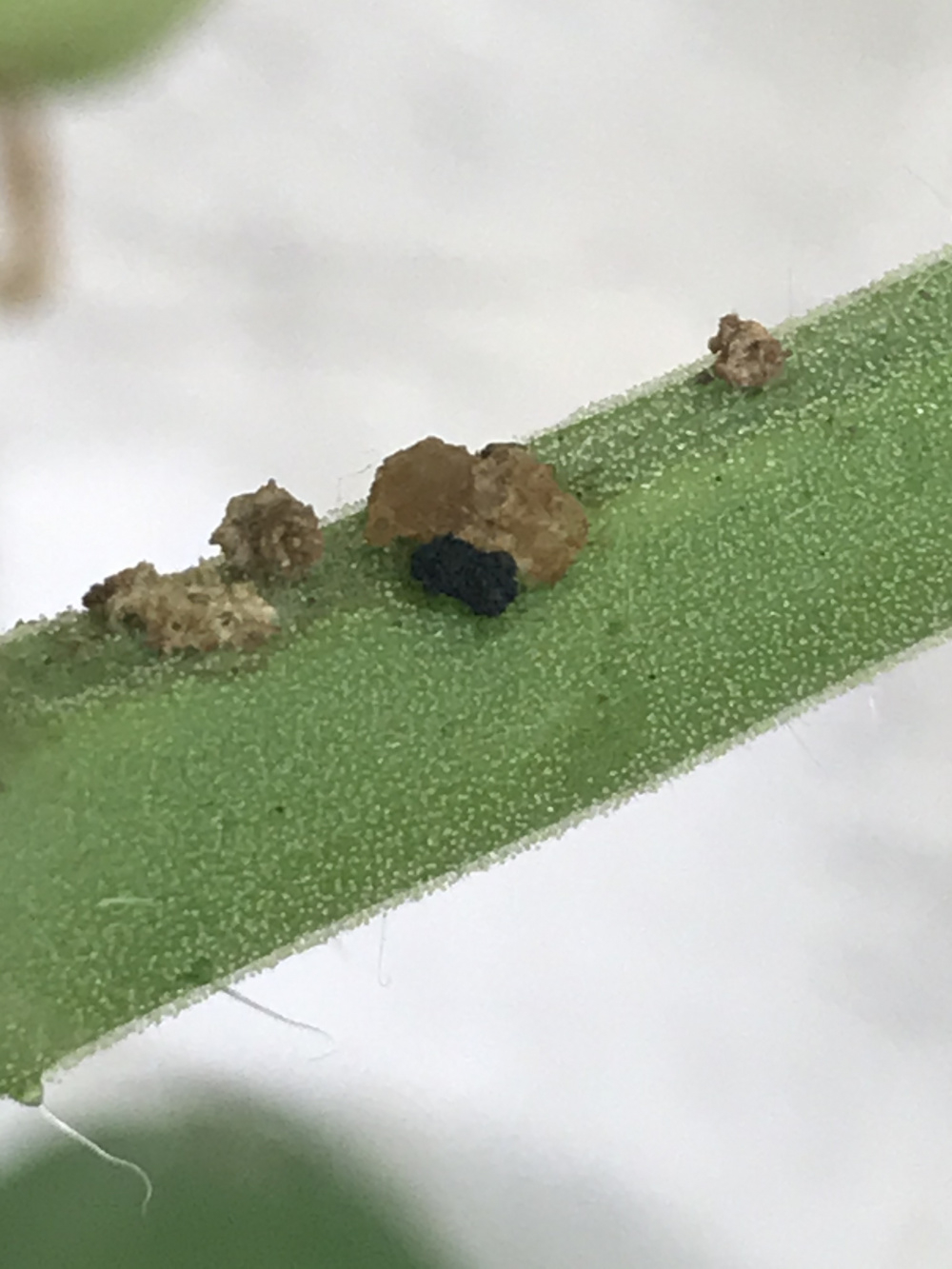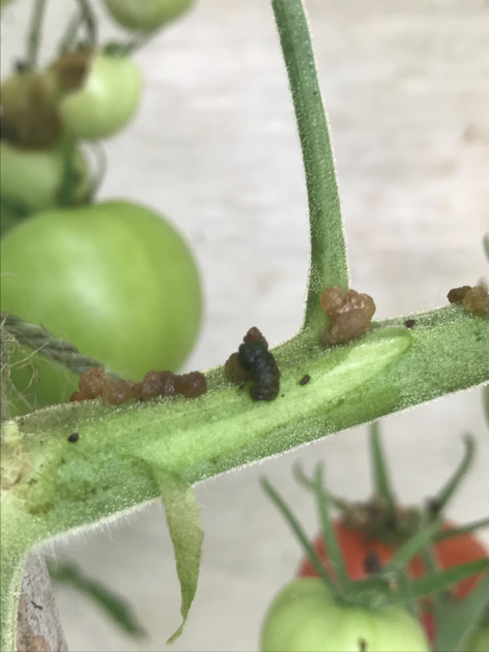 What is eating our greenhouse tomatoes? Black droppings and what look like greenish/white eggs on the stems. No slug trails. As you can see, the leaves are also being eaten.