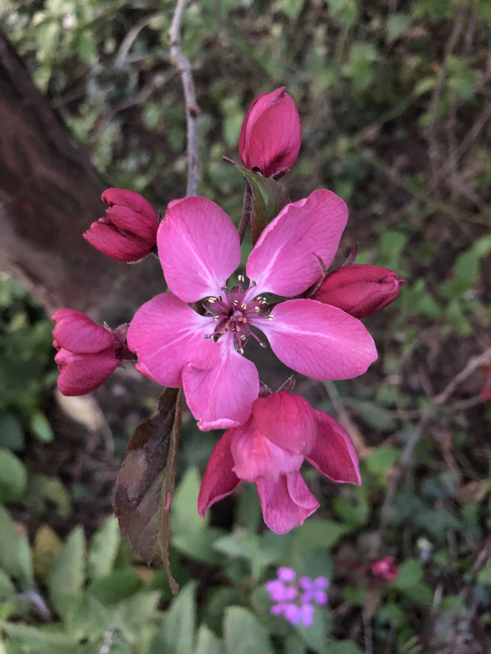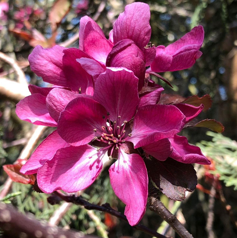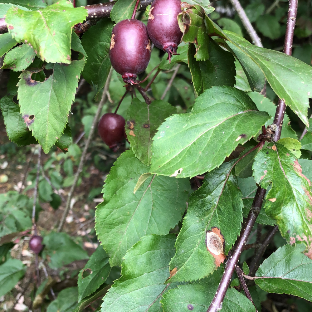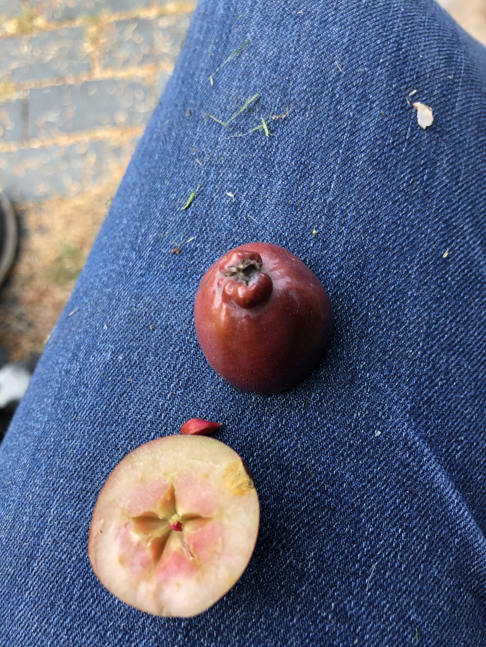 Advice please: We have what appears to be a weeping crabapple tree in our garden. I was told it was an ornamental crabapple, but I don’t know the variety and therefore if it’s safe to use the fruit to make jelly etc. I think it may be ‘purple prince’, but the fruit seems more elongated in shape, rather than apple round. Photos show flowers in Apr, fruit on tree Jul and as picked in Aug. When cut open has bright pinks pips (similar colour to the flowers). Thanks in advance for any help.