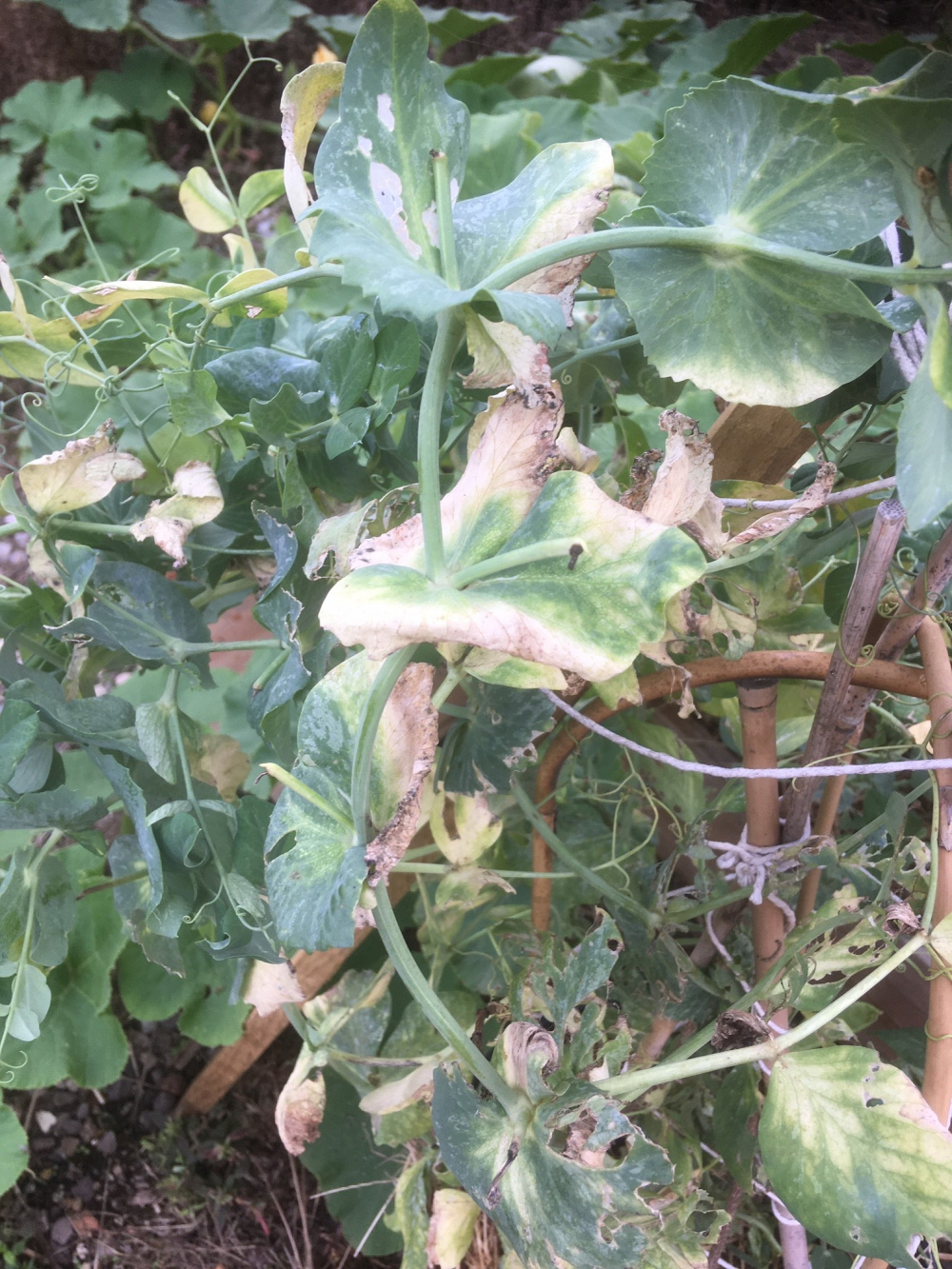While Im at it, do you think these sugar snaps have reached the end of their life, or perhaps theres another reason why the leaves are turning yellow? These were planted - I think - about 6 weeks ago. (They are in a pot rather than the veg bed).